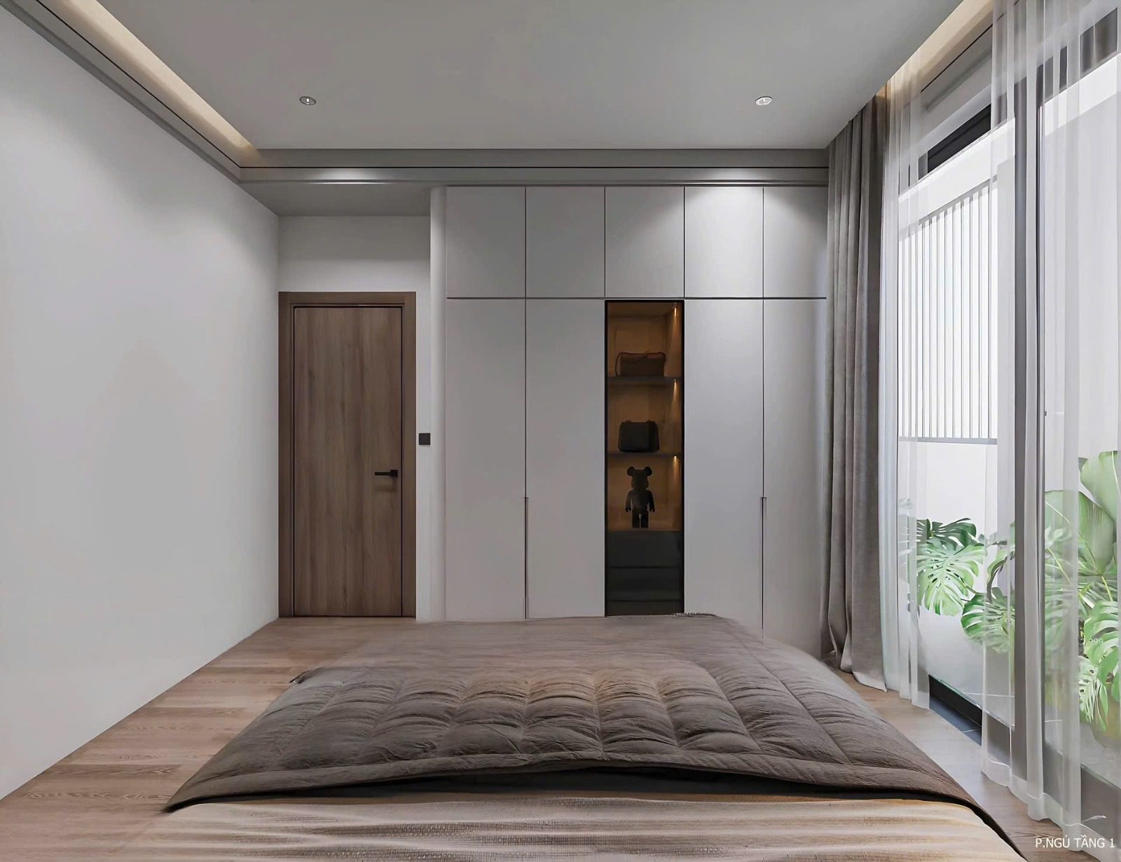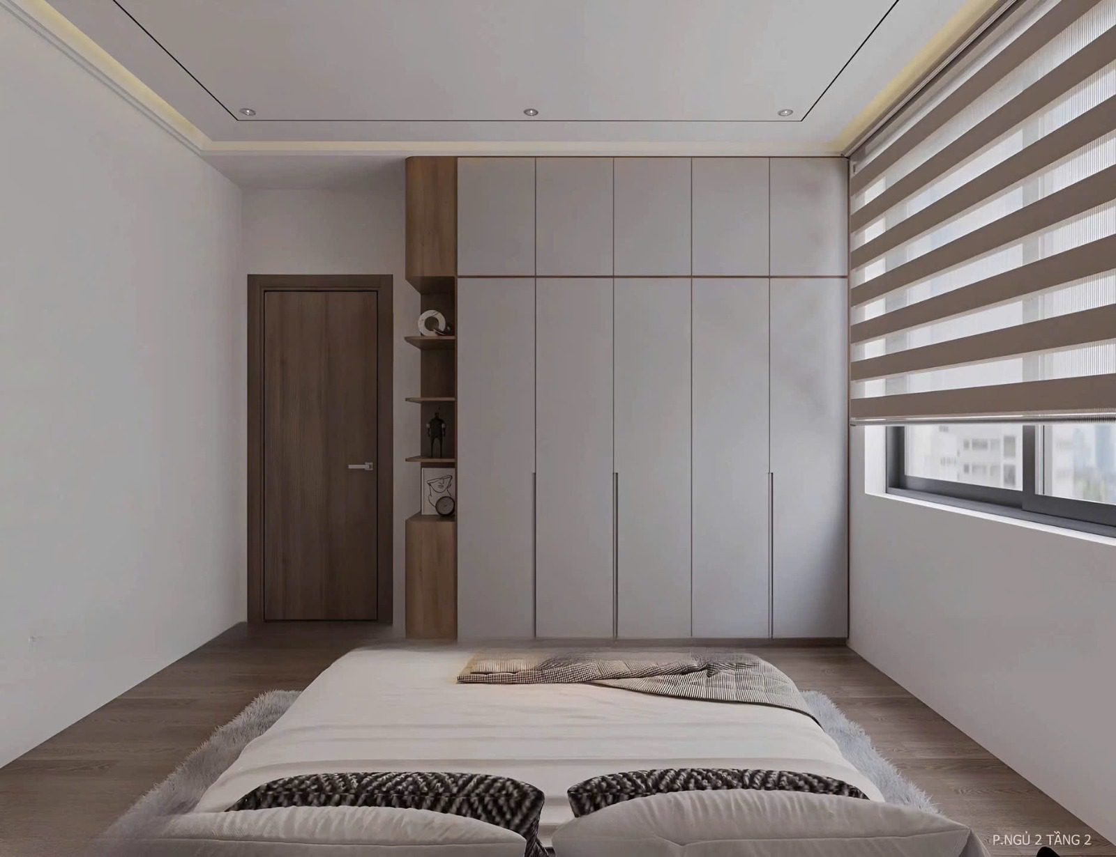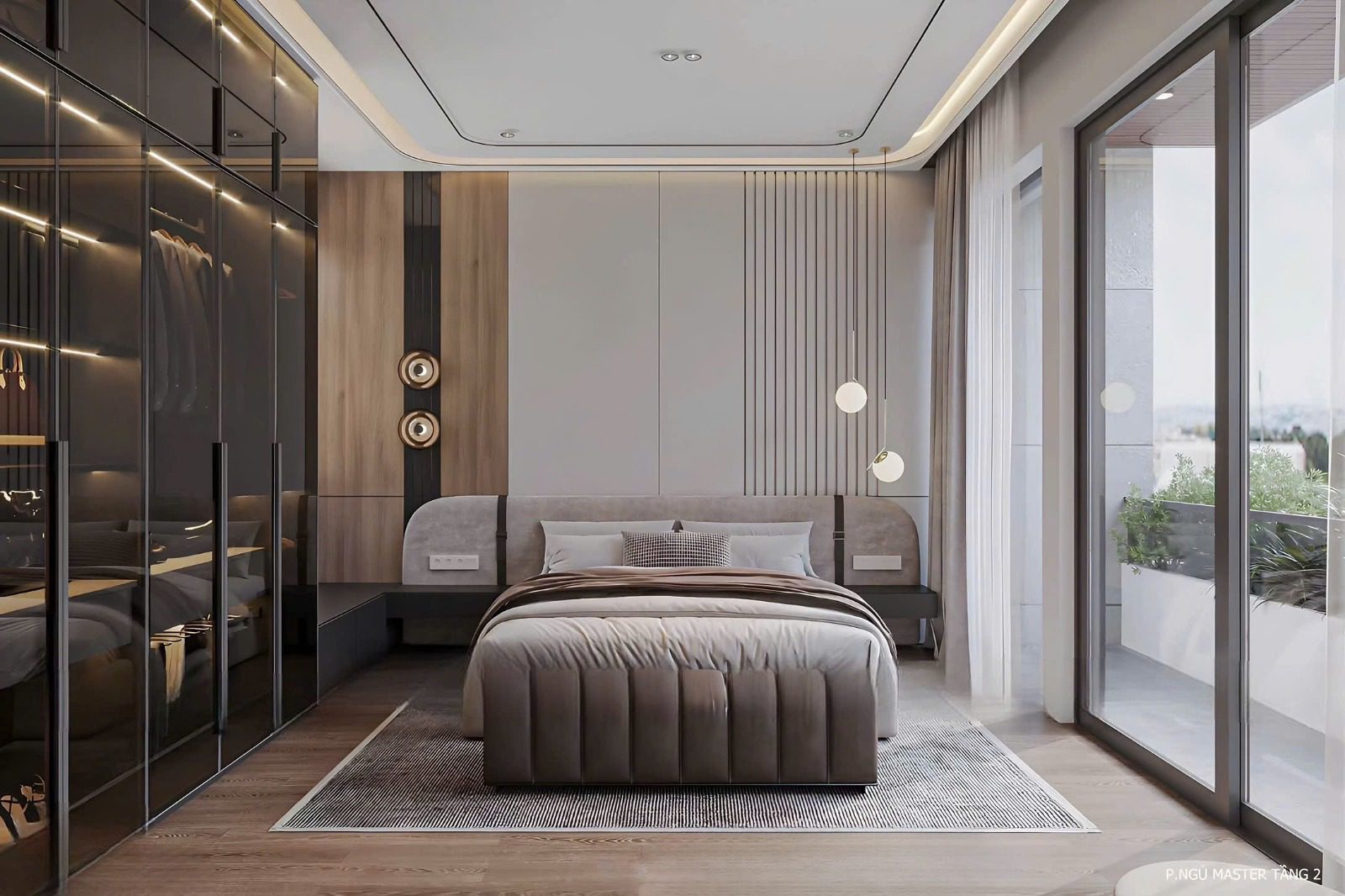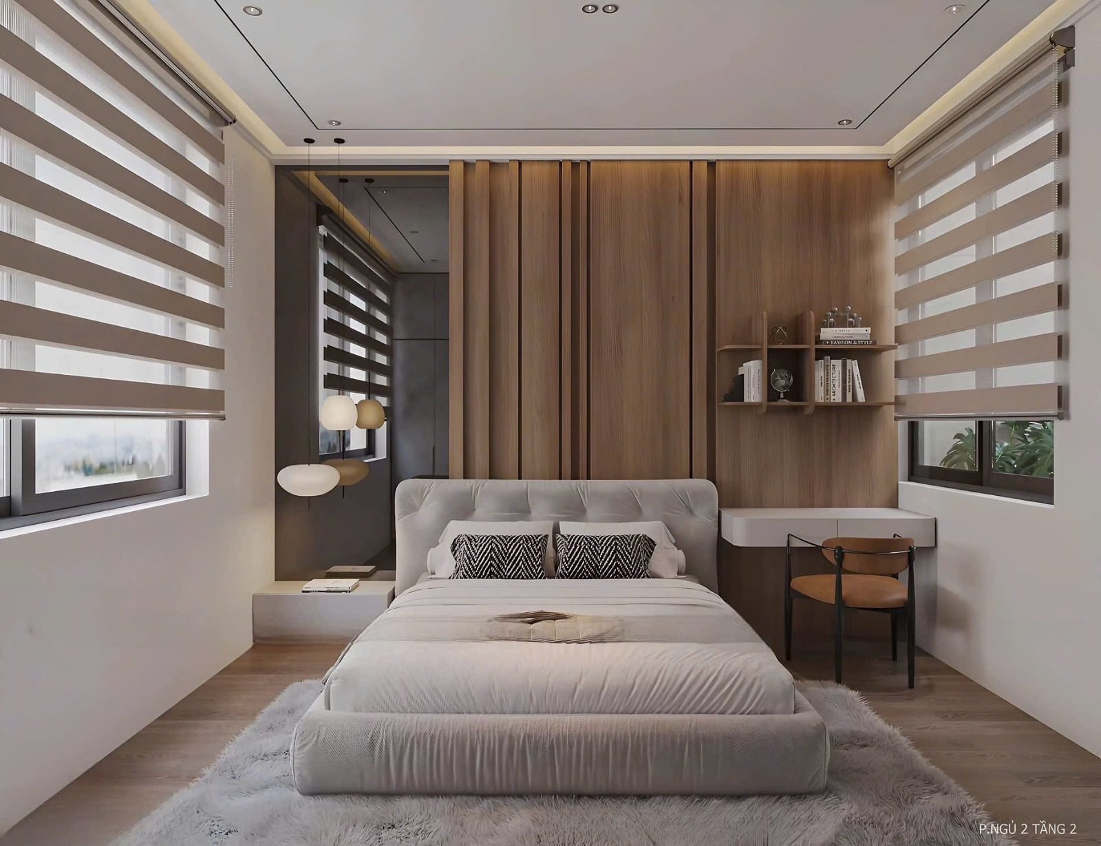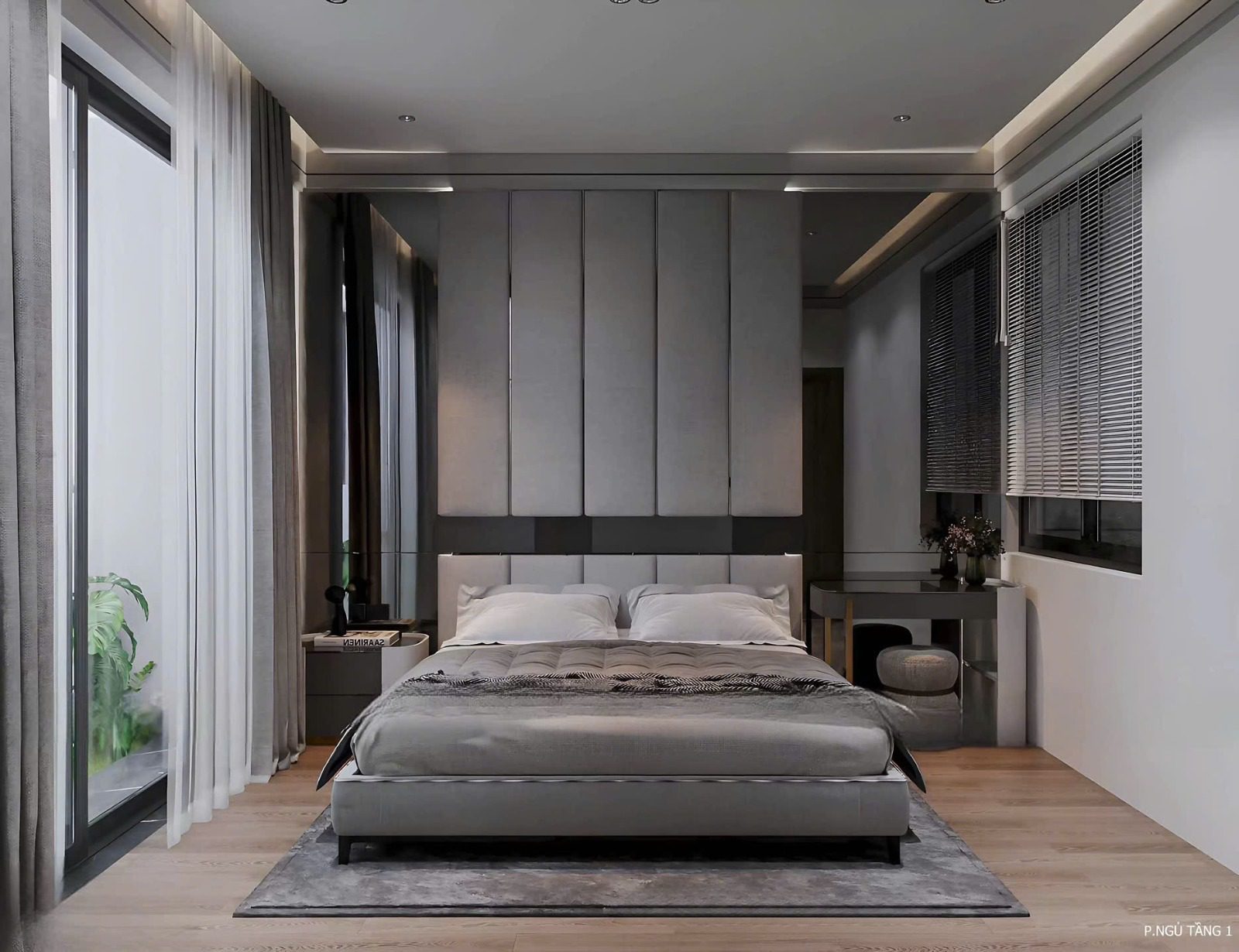Phòng ngủ sử dụng bảng màu trầm – ấm, thiên về xám và gỗ: