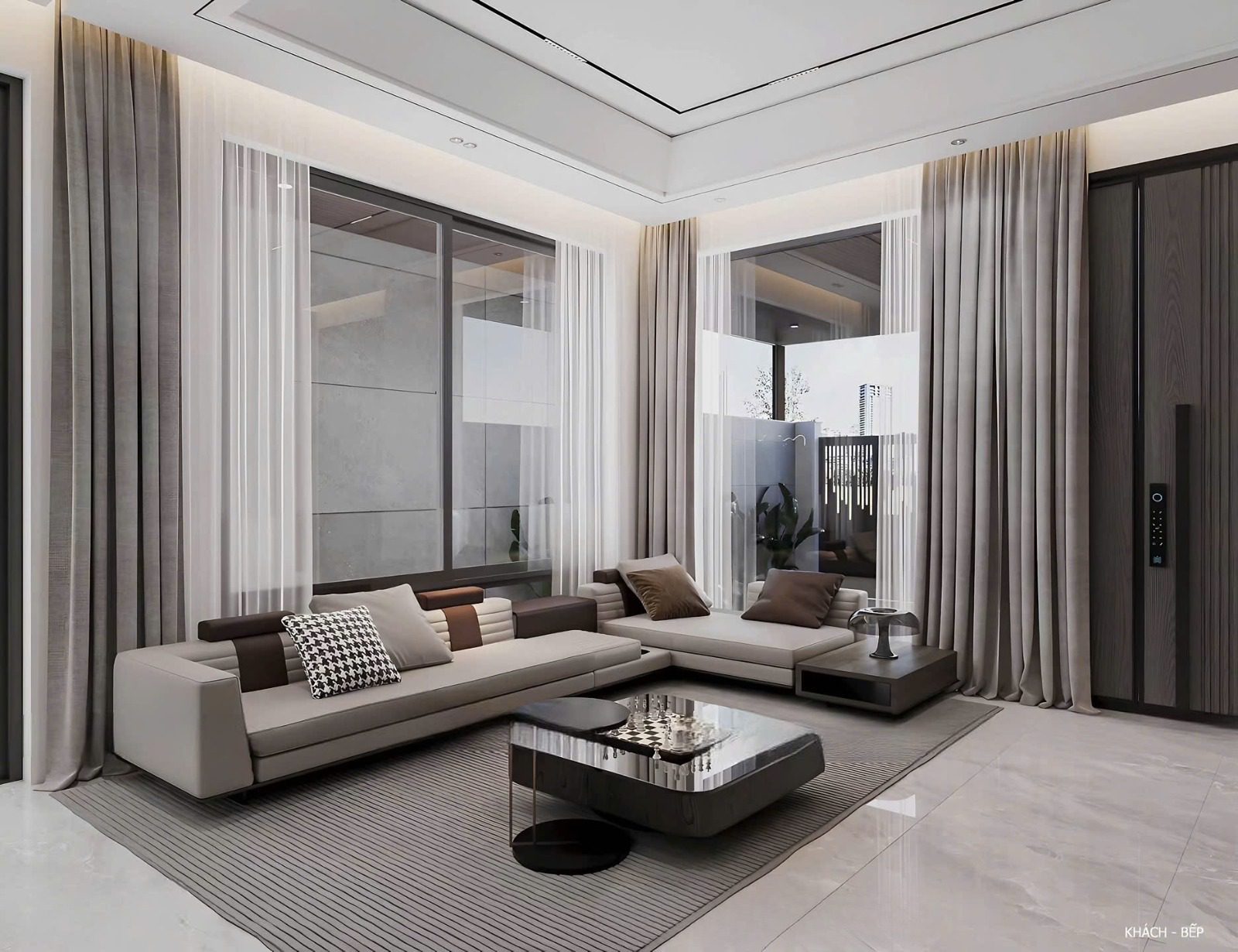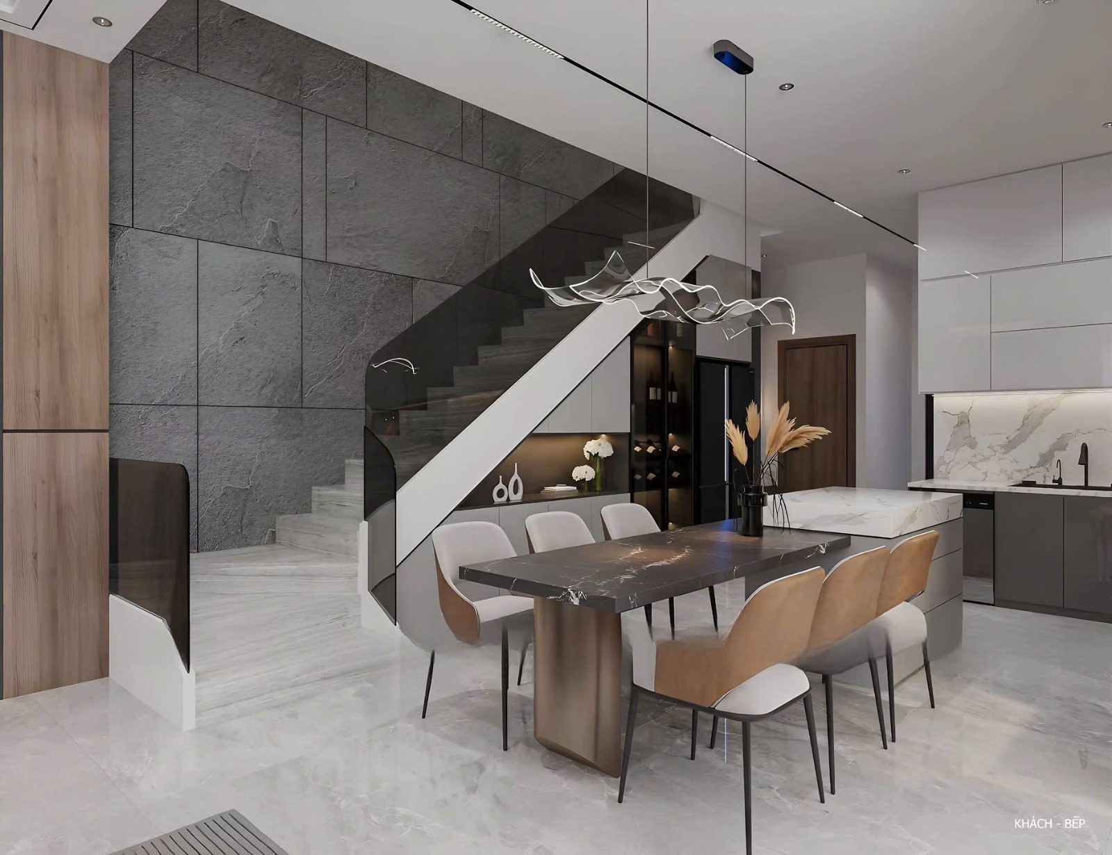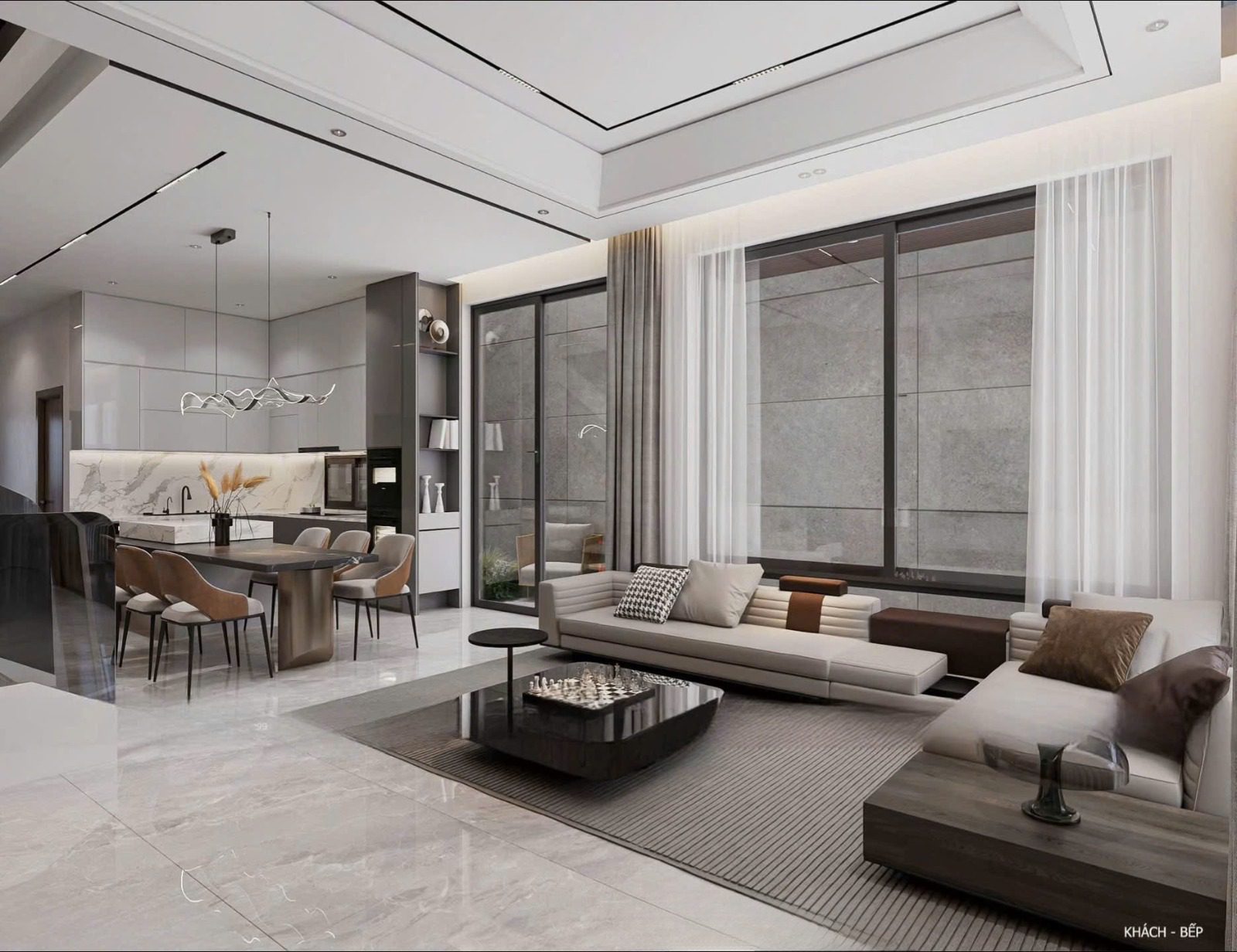 Tổng thể khu sinh hoạt chung được thiết kế theo trục mở – liên thông – ít vách ngăn, giúp không gian luôn thoáng và rộng hơn diện tích thực.