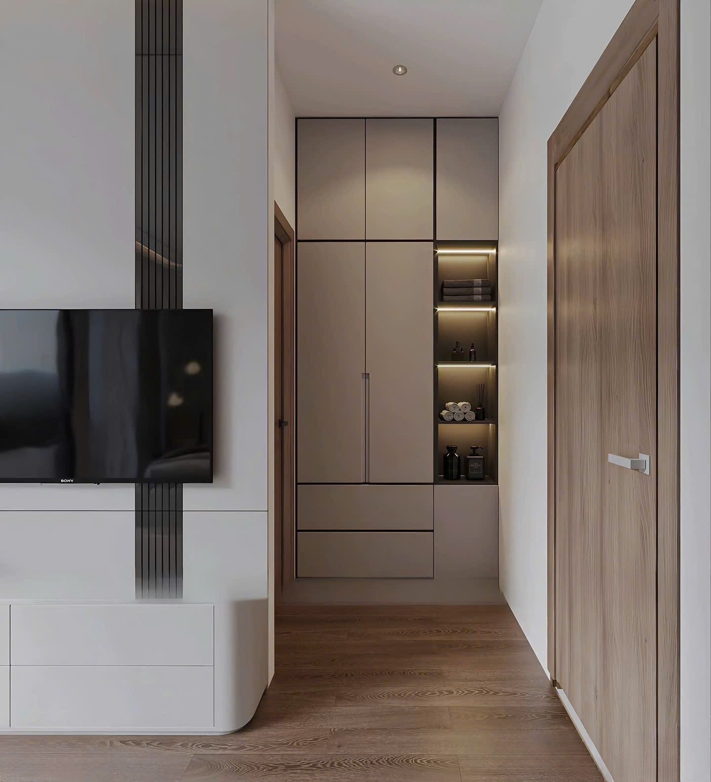 Mảng tường TV xử lý đá vân lớn + kệ âm → gọn gàng, dễ lau dọn, không rối mắt.
