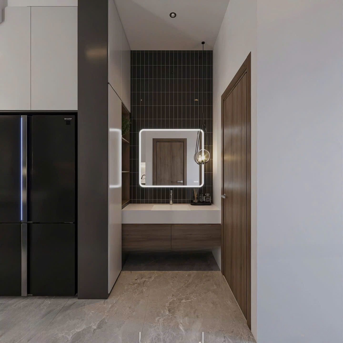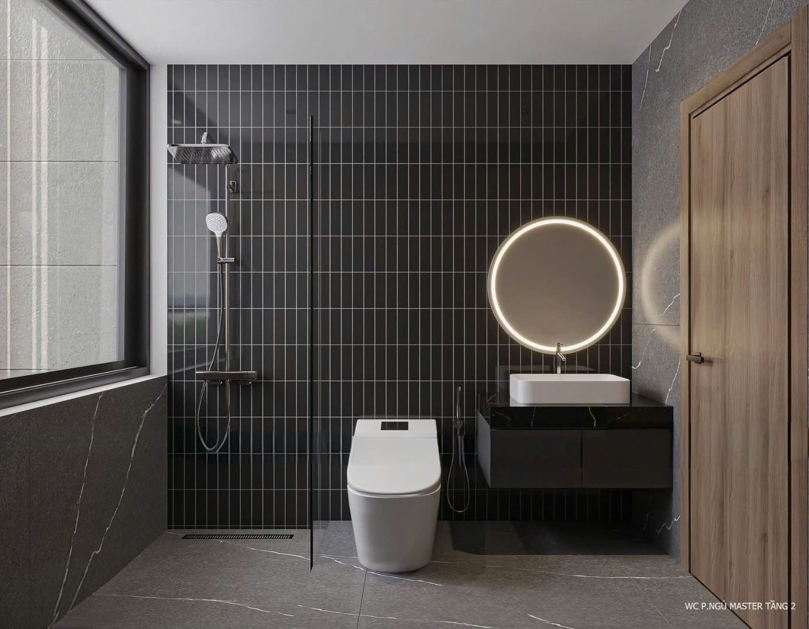 Phòng vệ sinh sử dụng gạch tone tối kết hợp lavabo treo: