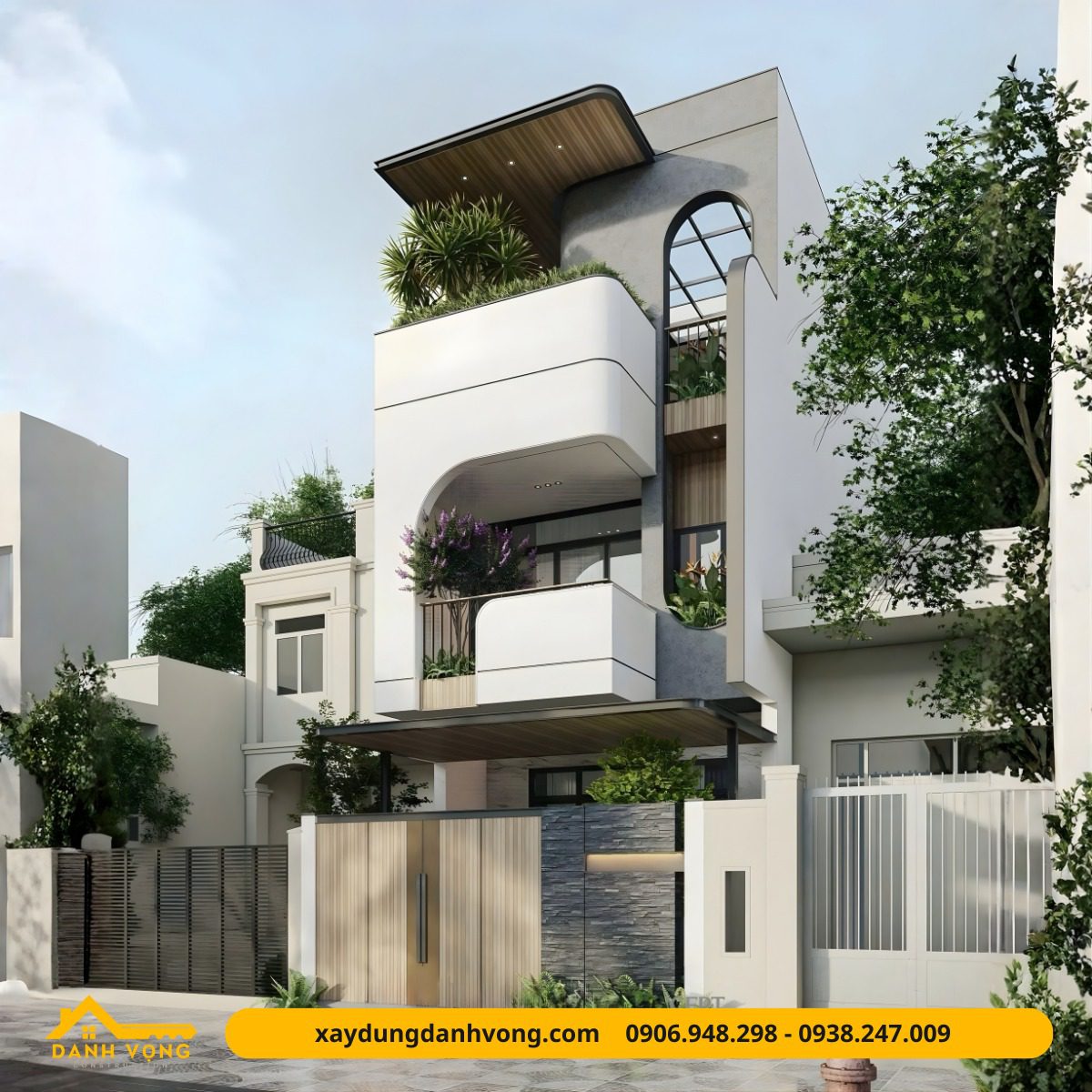 Arch & Leaf House là mẫu nhà phố hiện đại nổi bật với ngôn ngữ kiến trúc bo vòm mềm mại, kết hợp mảng xanh đan xen tinh tế, tạo nên một mặt tiền vừa ấn tượng thị giác vừa mang lại cảm giác sống gần gũi thiên nhiên.