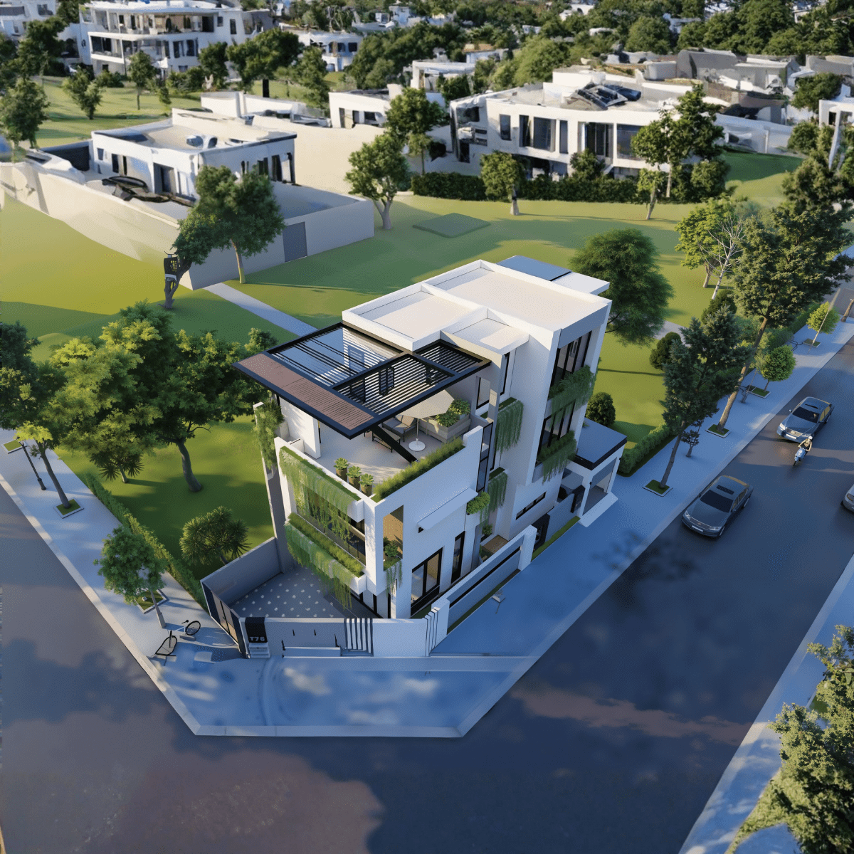 Mặt tiền được tổ chức theo bố cục mạch lạc, với các mảng khối vuông vức kết hợp hệ ban công trồng cây rủ tầng tầng lớp lớp. Cây xanh không chỉ đóng vai trò trang trí mà còn trở thành lớp đệm tự nhiên, giúp giảm nắng, cản bụi và mang lại vi khí hậu mát mẻ cho toàn bộ công trình.