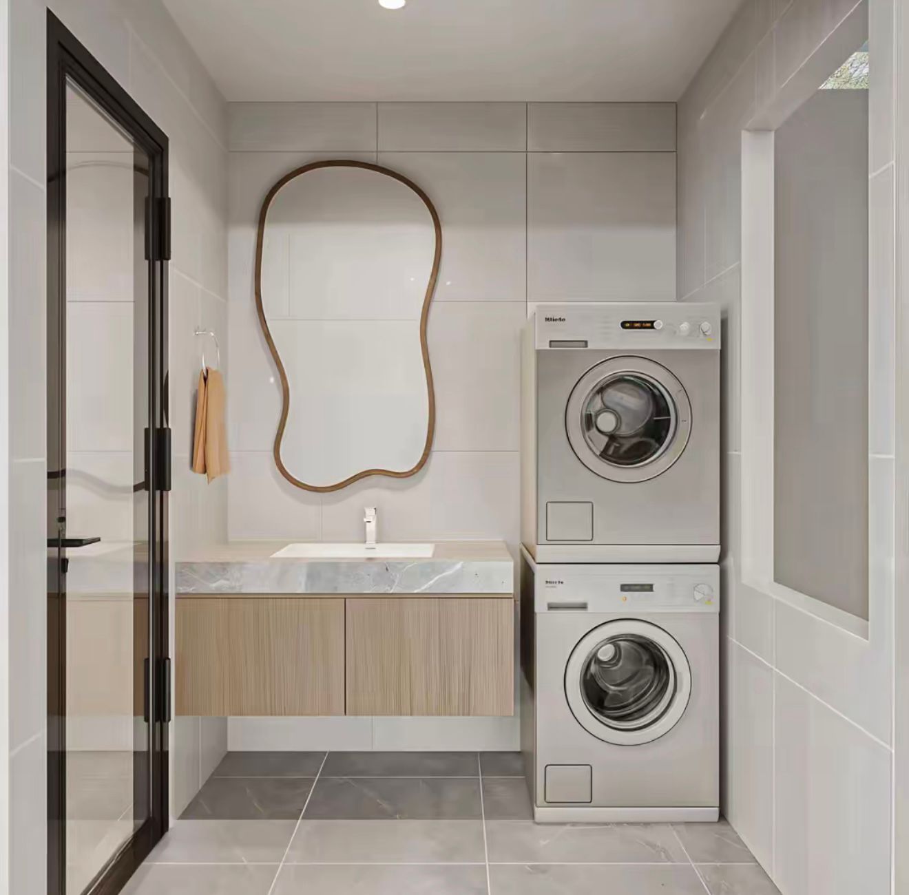 Khu giặt bố trí máy giặt sấy xếp tầng cực tiện, tiết kiệm diện tích