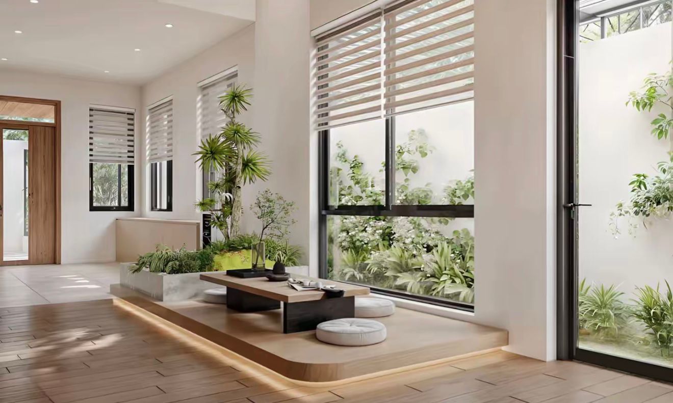 Cửa kính lớn + rèm 2 lớp → sáng ban ngày, riêng tư ban đêm