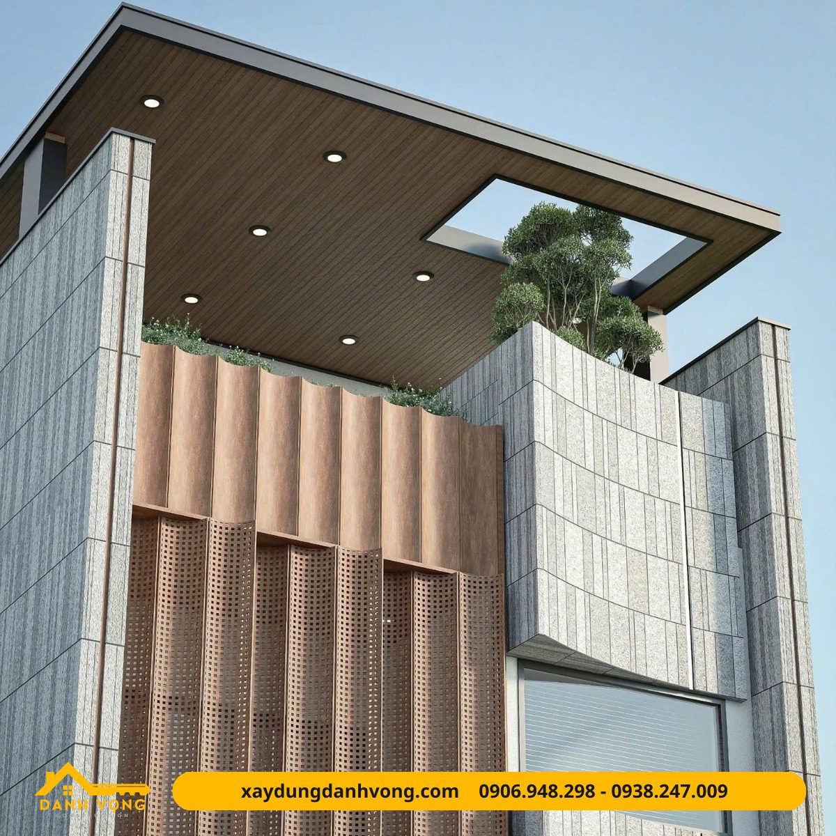 Điểm nhấn nổi bật nhất của công trình nằm ở hệ lam đứng trang trí được xử lý khéo léo xuyên suốt mặt tiền. Không chỉ đóng vai trò thẩm mỹ, hệ lam còn giúp che nắng, giảm bức xạ nhiệt và tăng tính riêng tư – một giải pháp rất hiệu quả cho nhà phố 3 tầng.