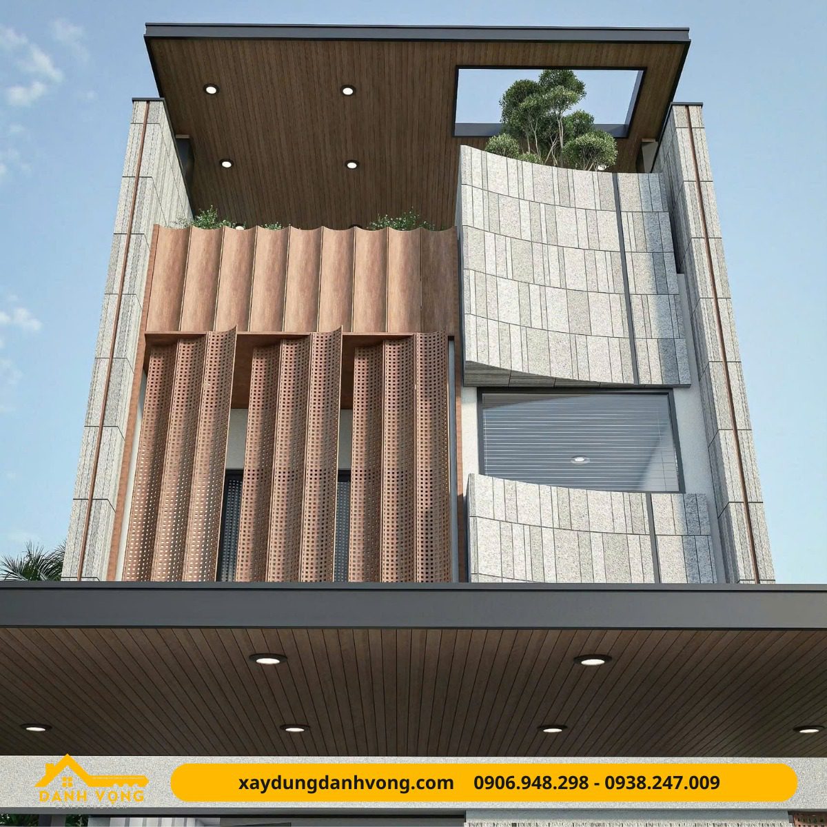 Bố cục mặt tiền được phân tầng rõ ràng, các mảng đặc – rỗng đan xen hợp lý, giúp công trình trông cao ráo, vững chãi nhưng không nặng nề.