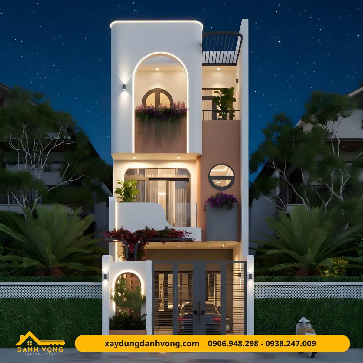 Với định hướng cân bằng giữa thẩm mỹ – công năng – không gian xanh, công trình mang đến một diện mạo thanh lịch, tinh tế, nổi bật bởi nét bo cong nhẹ nhàng nhưng vẫn giữ được sự mạch lạc và sang trọng đúng tinh thần kiến trúc hiện đại.
