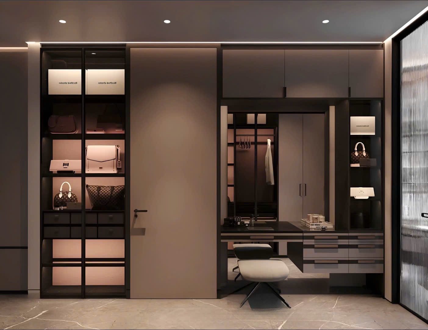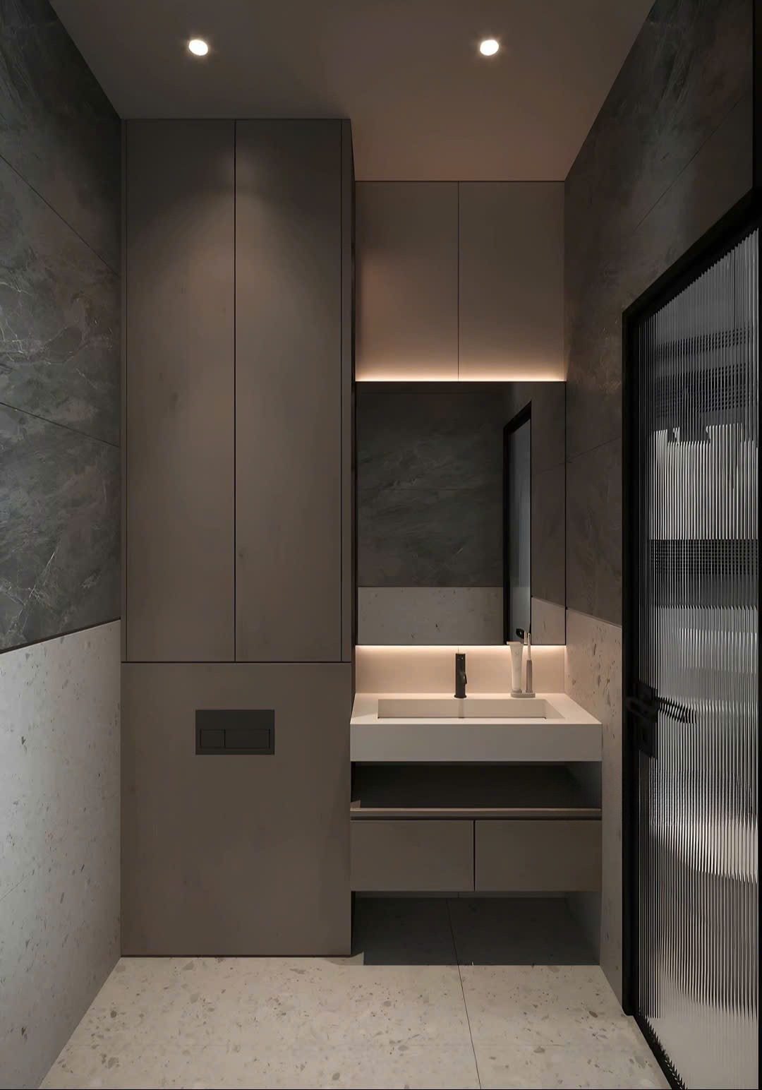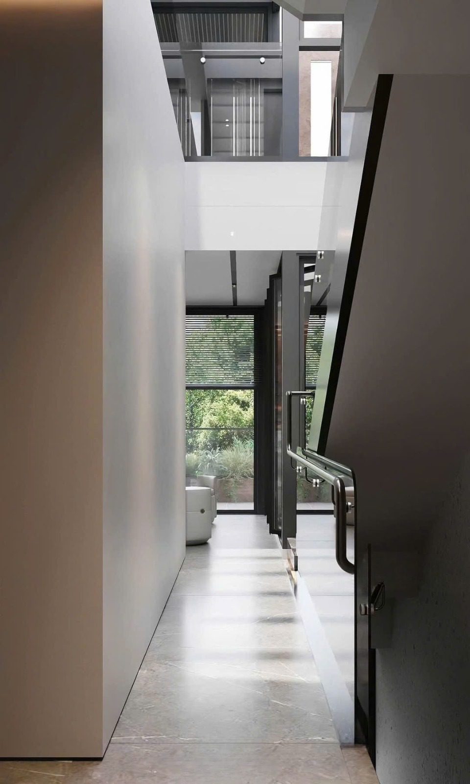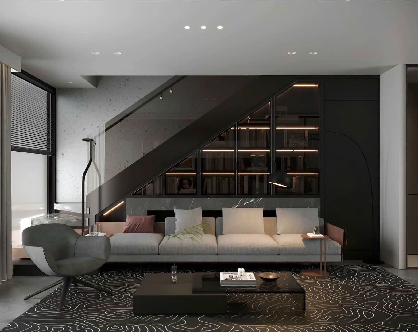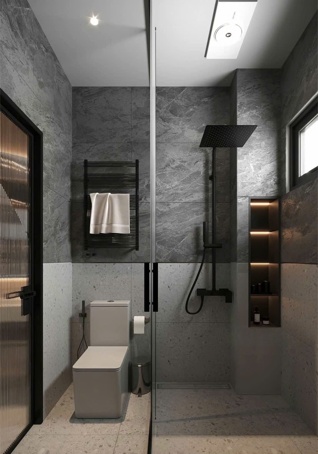 Bảng màu trung tính gồm xám đá – trắng – ghi đậm, kết hợp vật liệu kính và lam kim loại sơn tĩnh điện, mang lại vẻ đẹp sang trọng, bền vững theo thời gian.