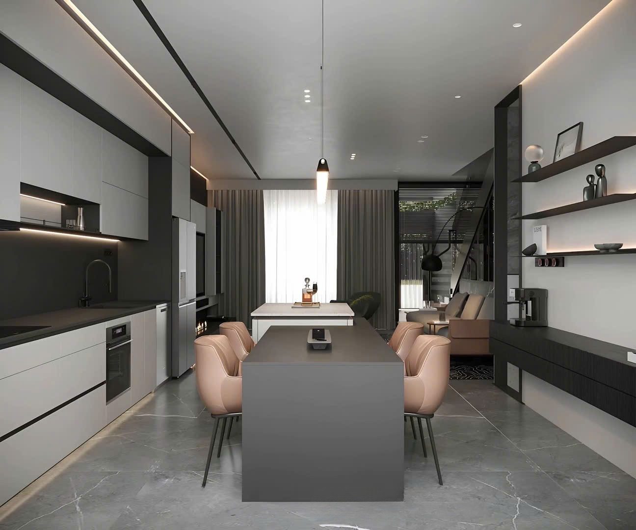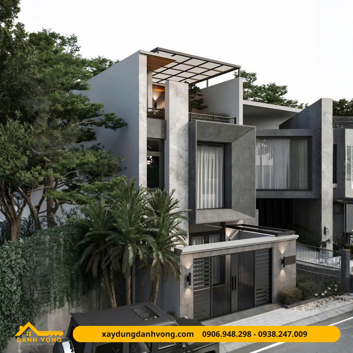 Công trình nhà phố 3 tầng được định hình theo phong cách hiện đại – tối giản, nổi bật với sự kết hợp tinh tế giữa hình khối vuông vức và những đường giật cấp mạnh mẽ.