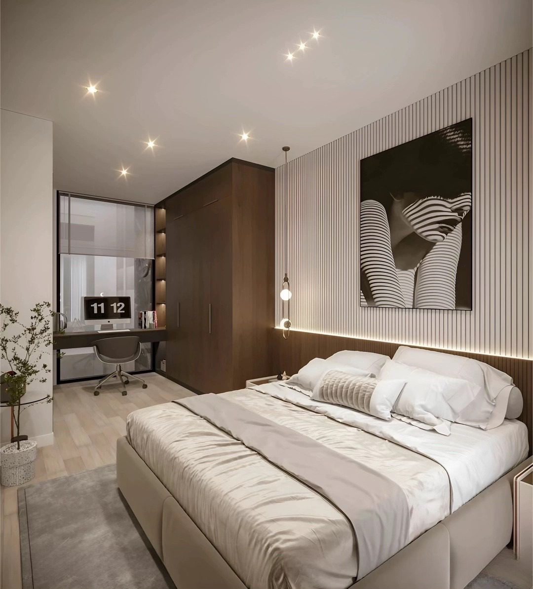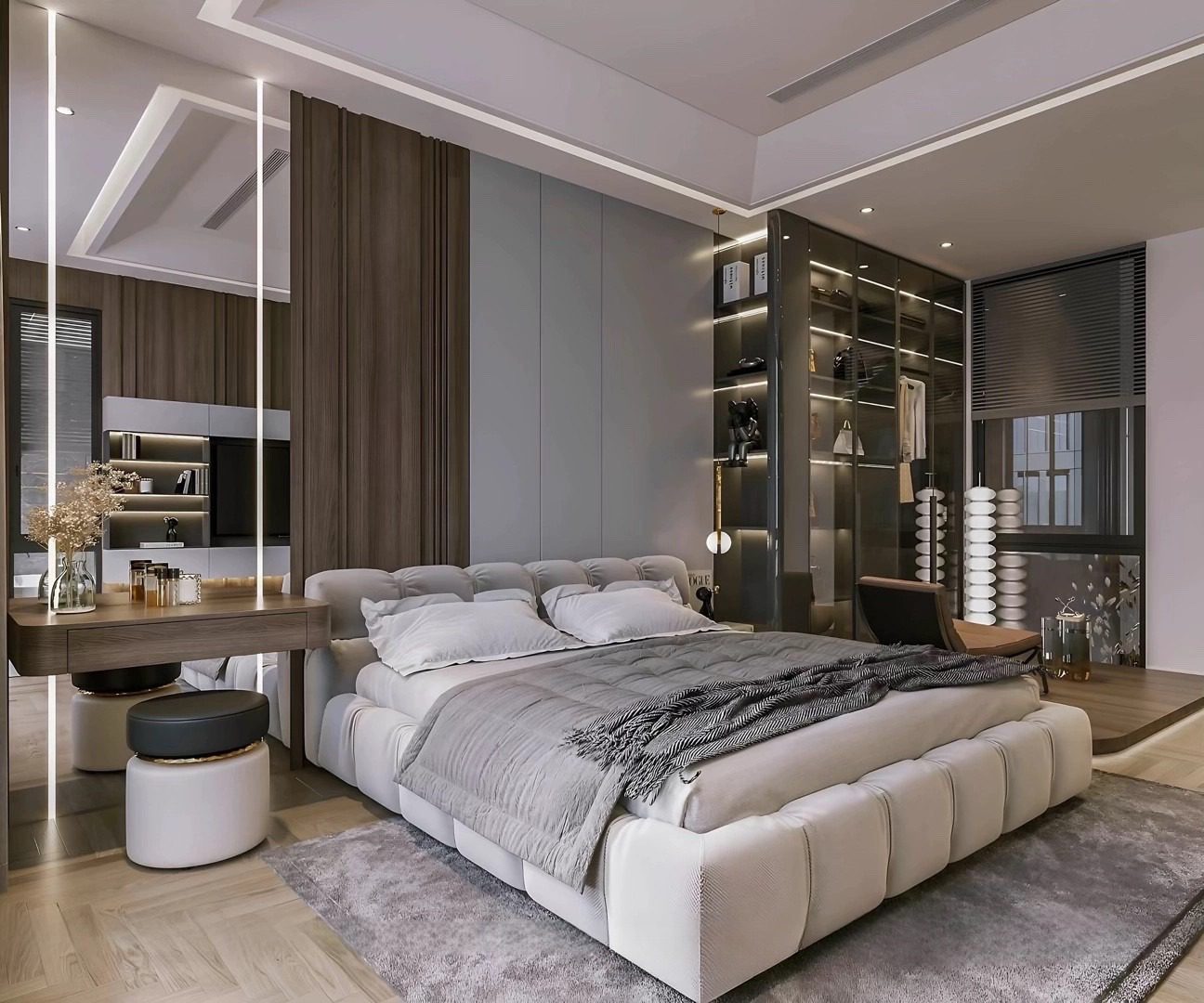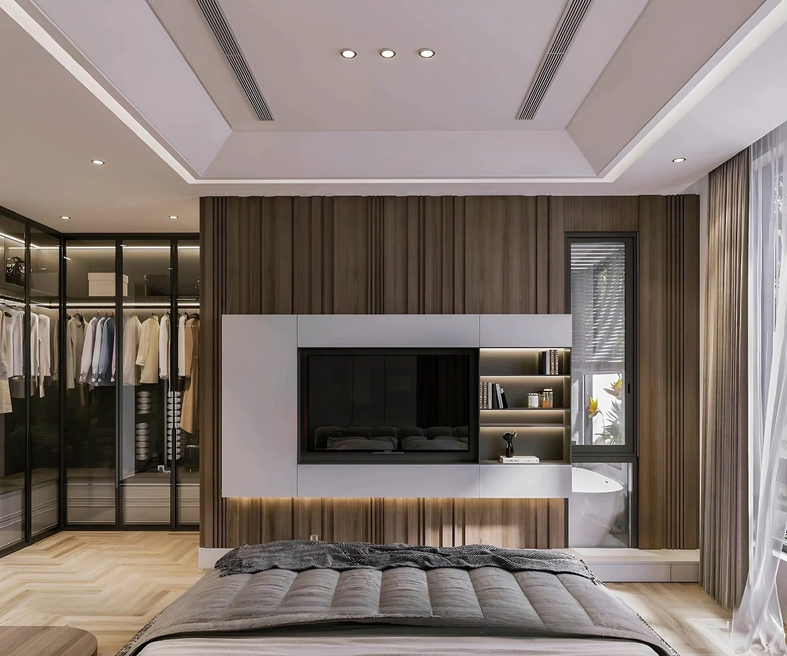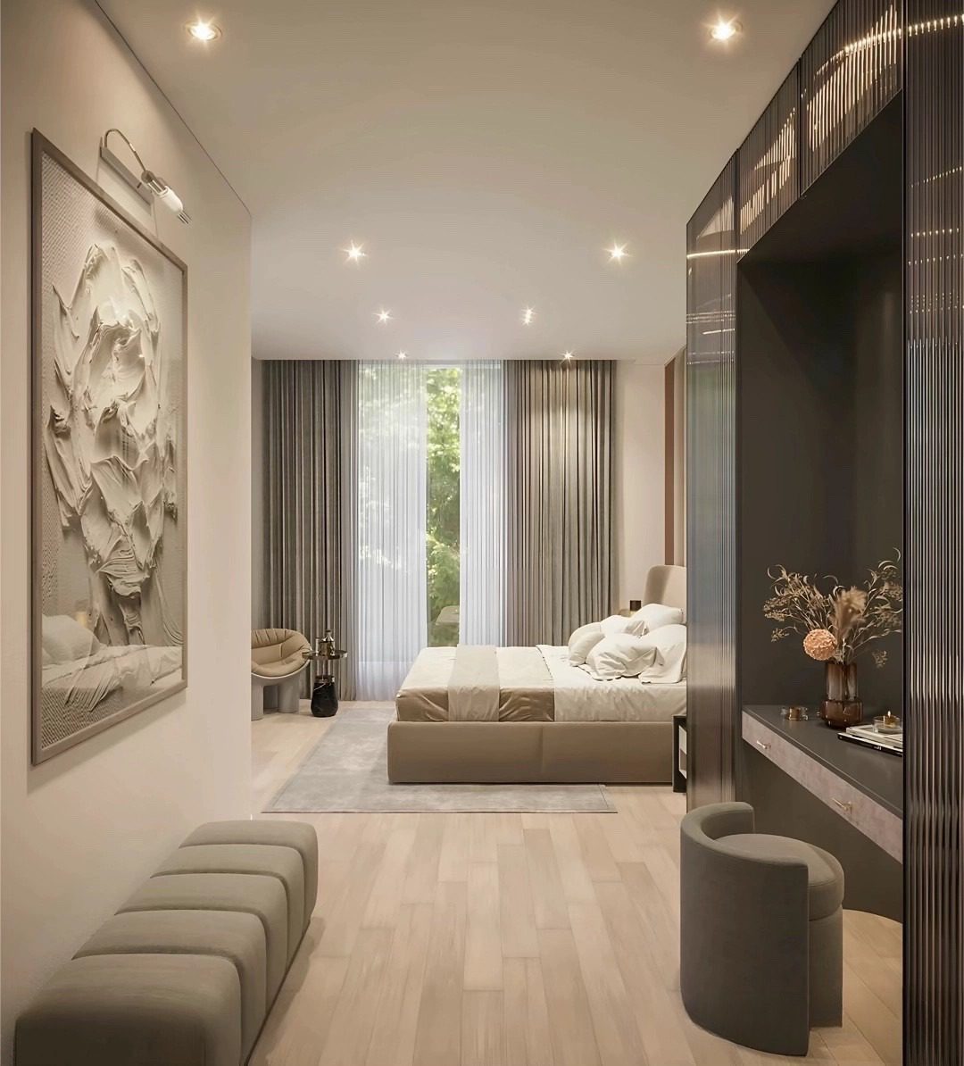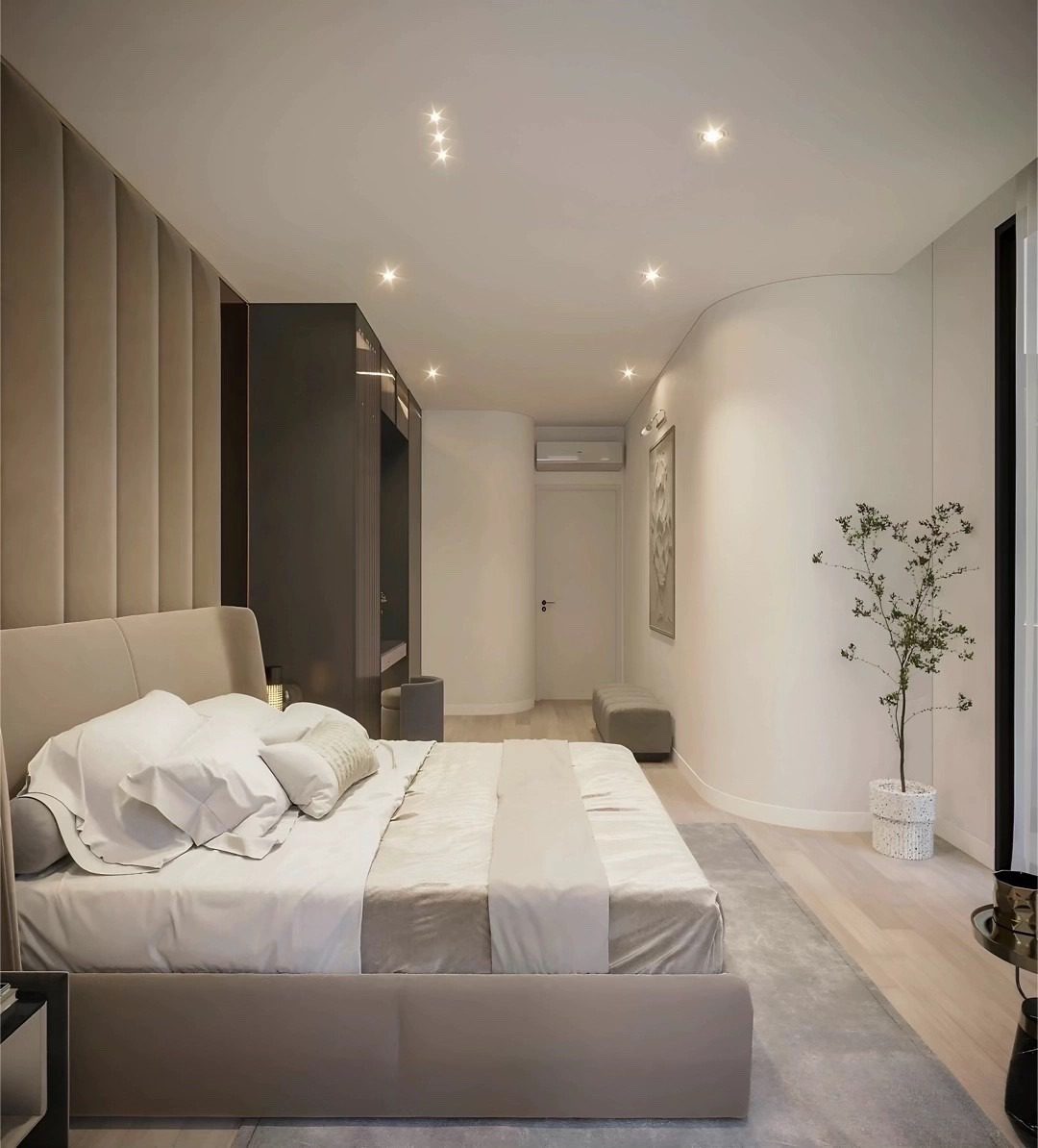 Khu vực sinh hoạt riêng tư với các phòng ngủ, mỗi phòng đều được tiếp cận ánh sáng và thông gió tự nhiên thông qua ban công hoặc cửa sổ lớn.