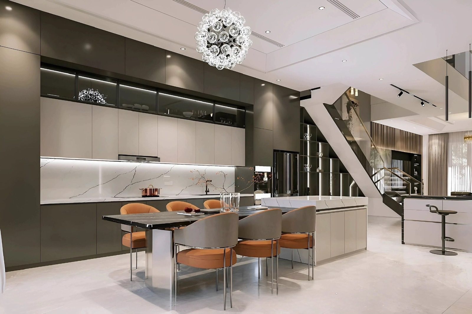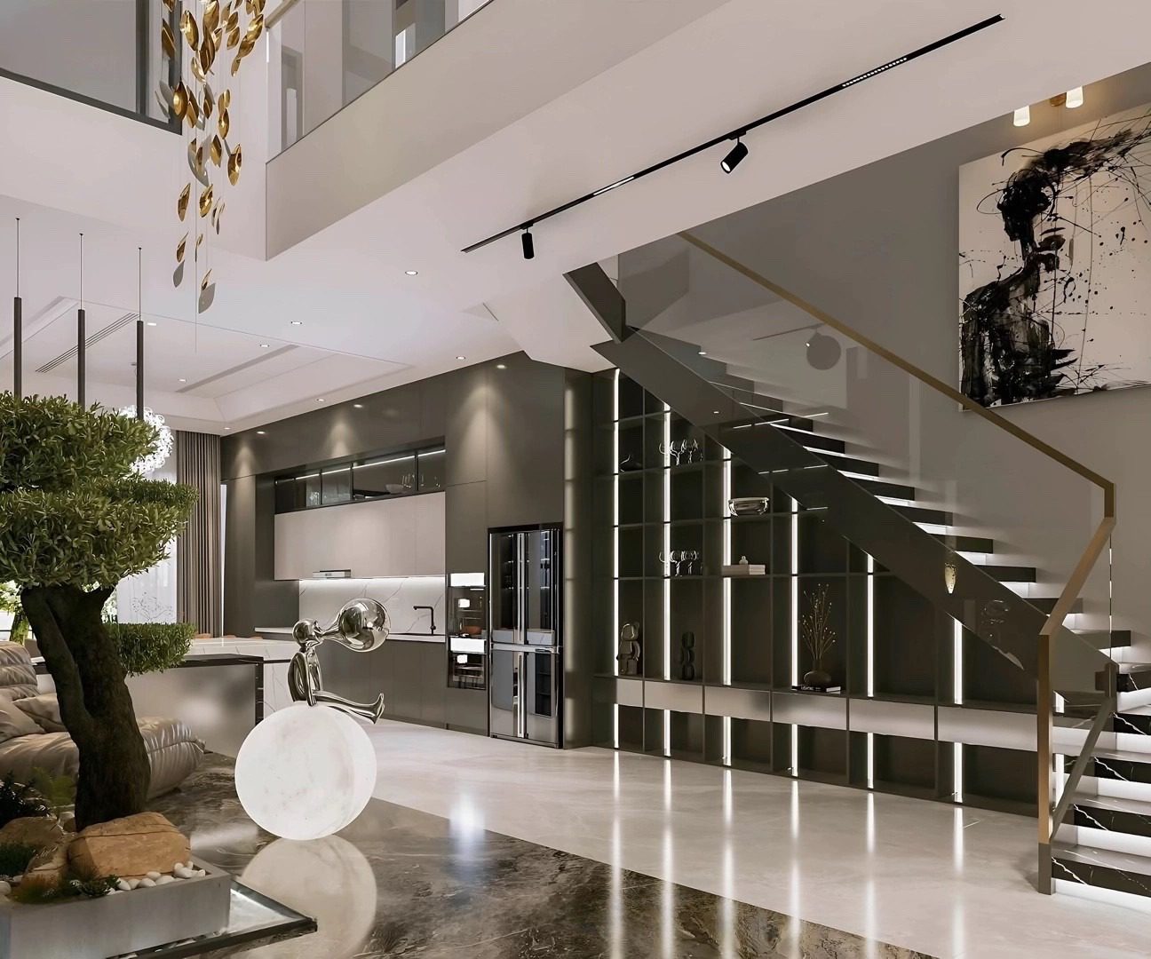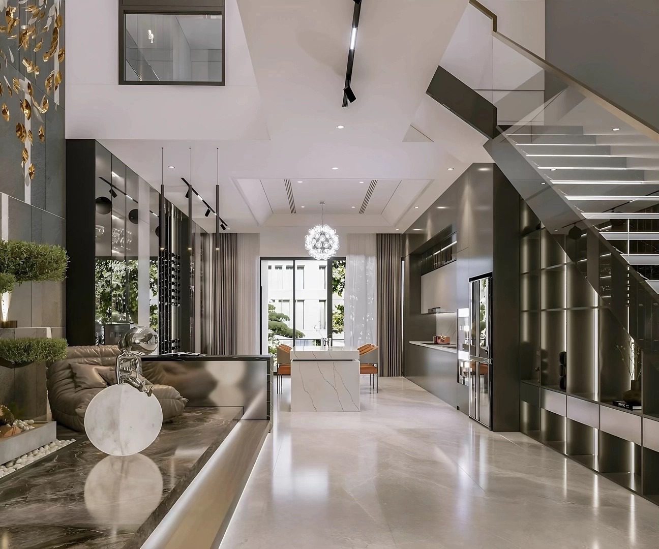 Các mảng kính lớn xuyên suốt theo chiều cao giúp ngôi nhà luôn mở rộng về thị giác, kết nối liên tục giữa không gian bên trong và cảnh quan bên ngoài.