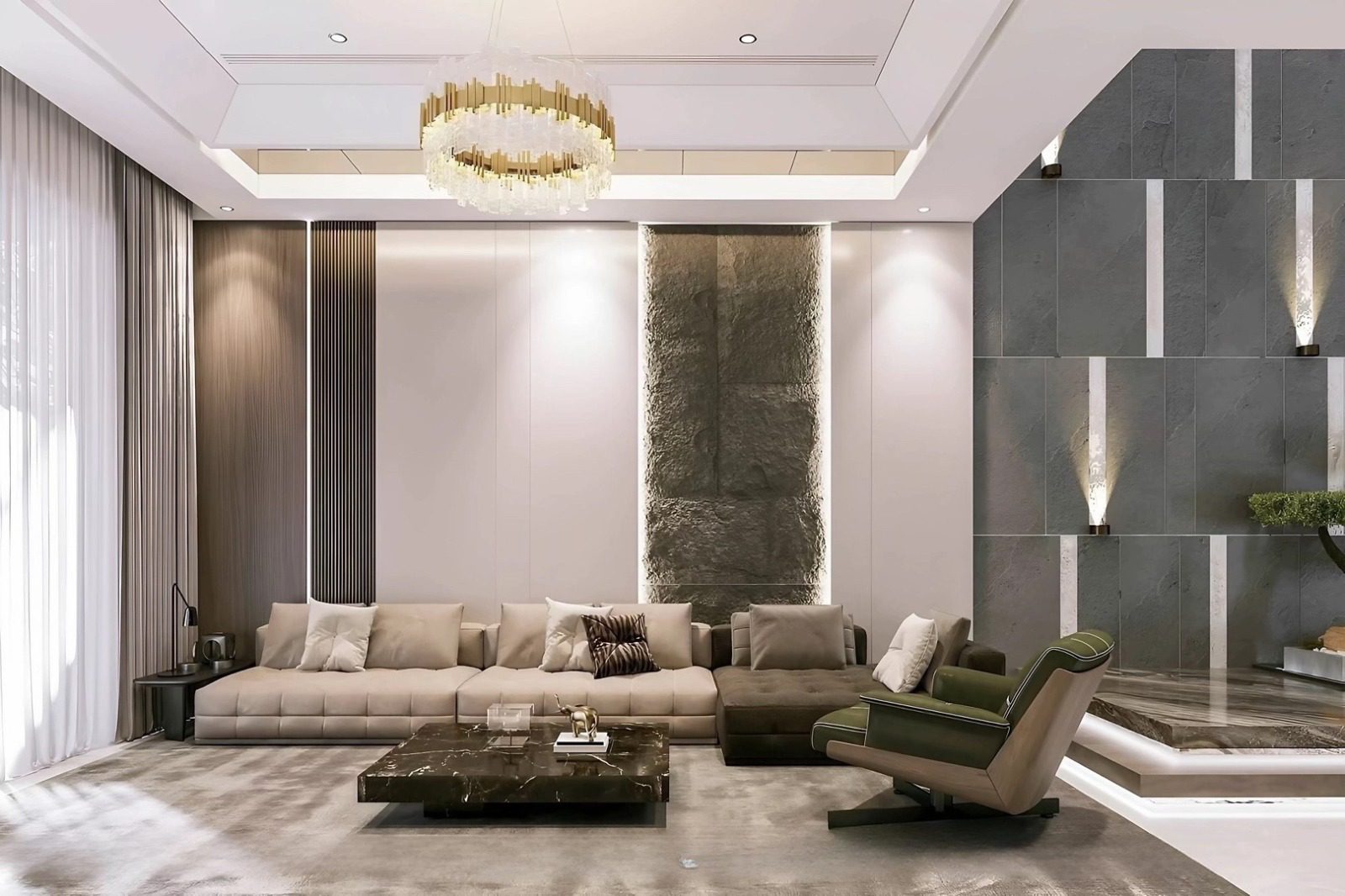 Bảng màu trung tính chủ đạo gồm xám bê tông – trắng – nâu gỗ, tạo cảm giác sang trọng nhưng không lạnh. Gỗ được sử dụng có chủ đích tại trần ban công, lam che và cổng, mang lại sự ấm áp, cân bằng với chất liệu thô của bê tông.