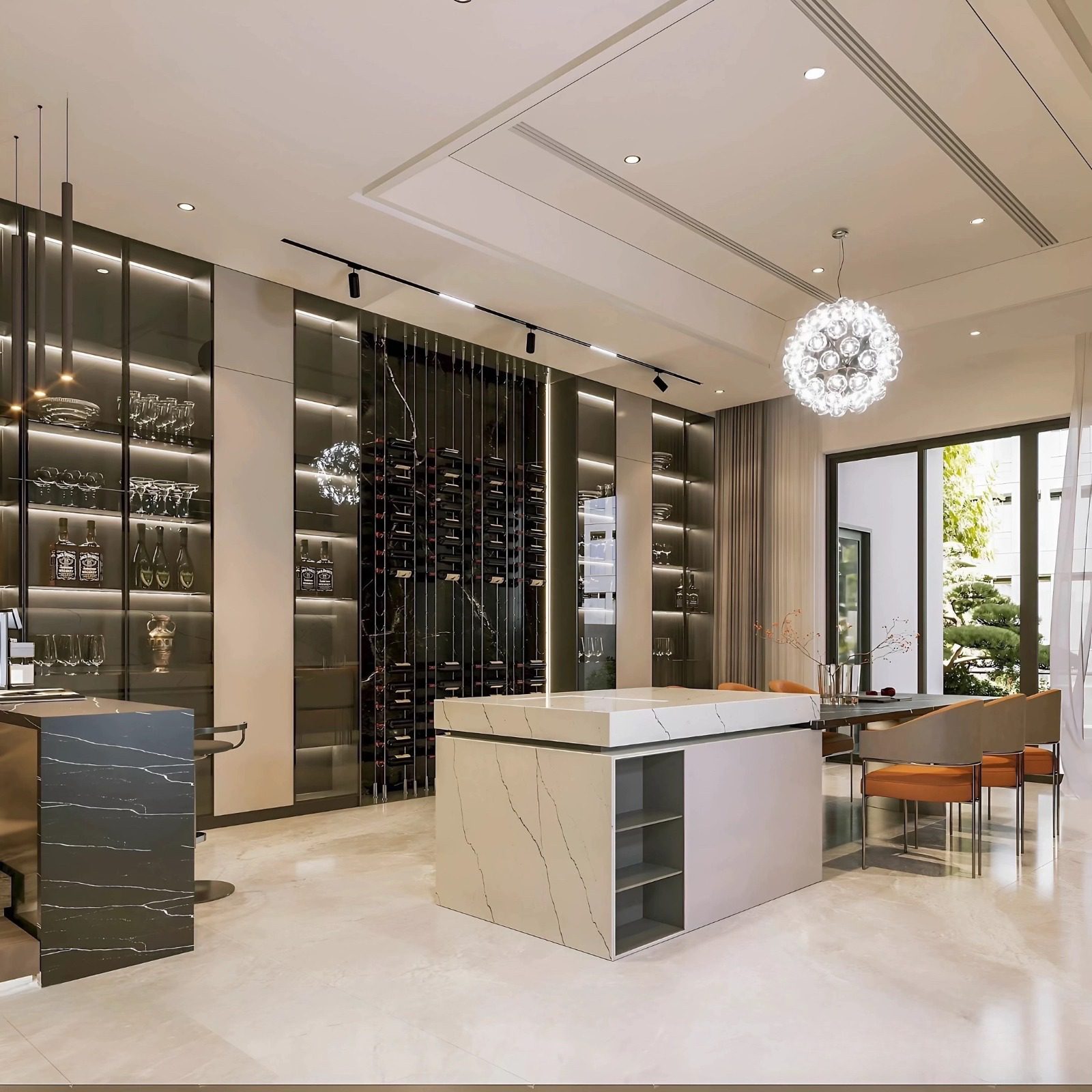Hệ đèn LED âm khe được bố trí khéo léo chạy theo khung kiến trúc, giúp mặt tiền nổi bật về đêm, tôn lên các đường nét hình khối và tạo chiều sâu ánh sáng đầy cảm xúc.