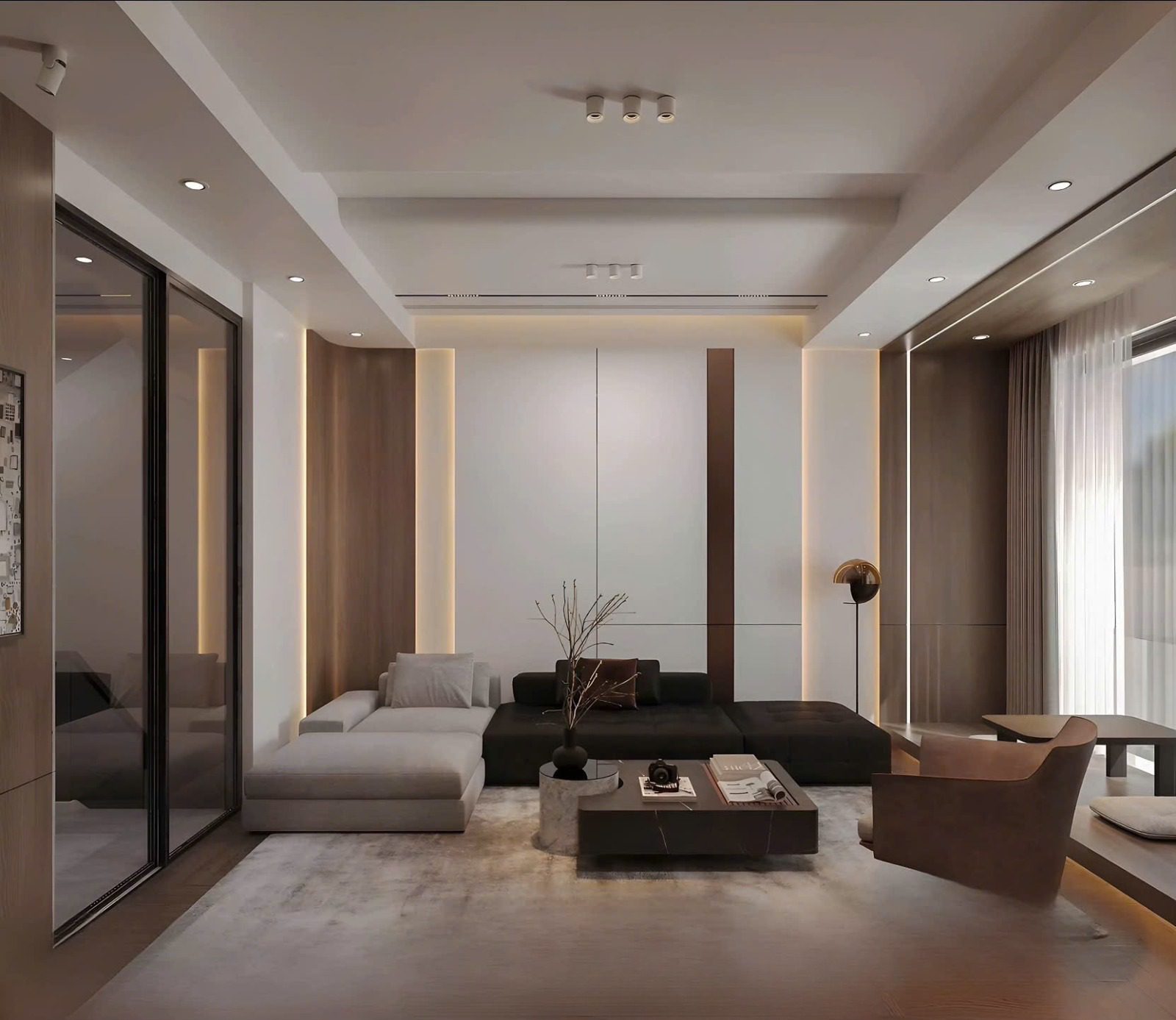 Bảng màu chủ đạo của công trình là trắng – xám – ghi đậm, kết hợp vật liệu gỗ nhựa ngoài trời và đá ốp, tạo nên một tổng thể sang trọng, tinh tế nhưng không phô trương.