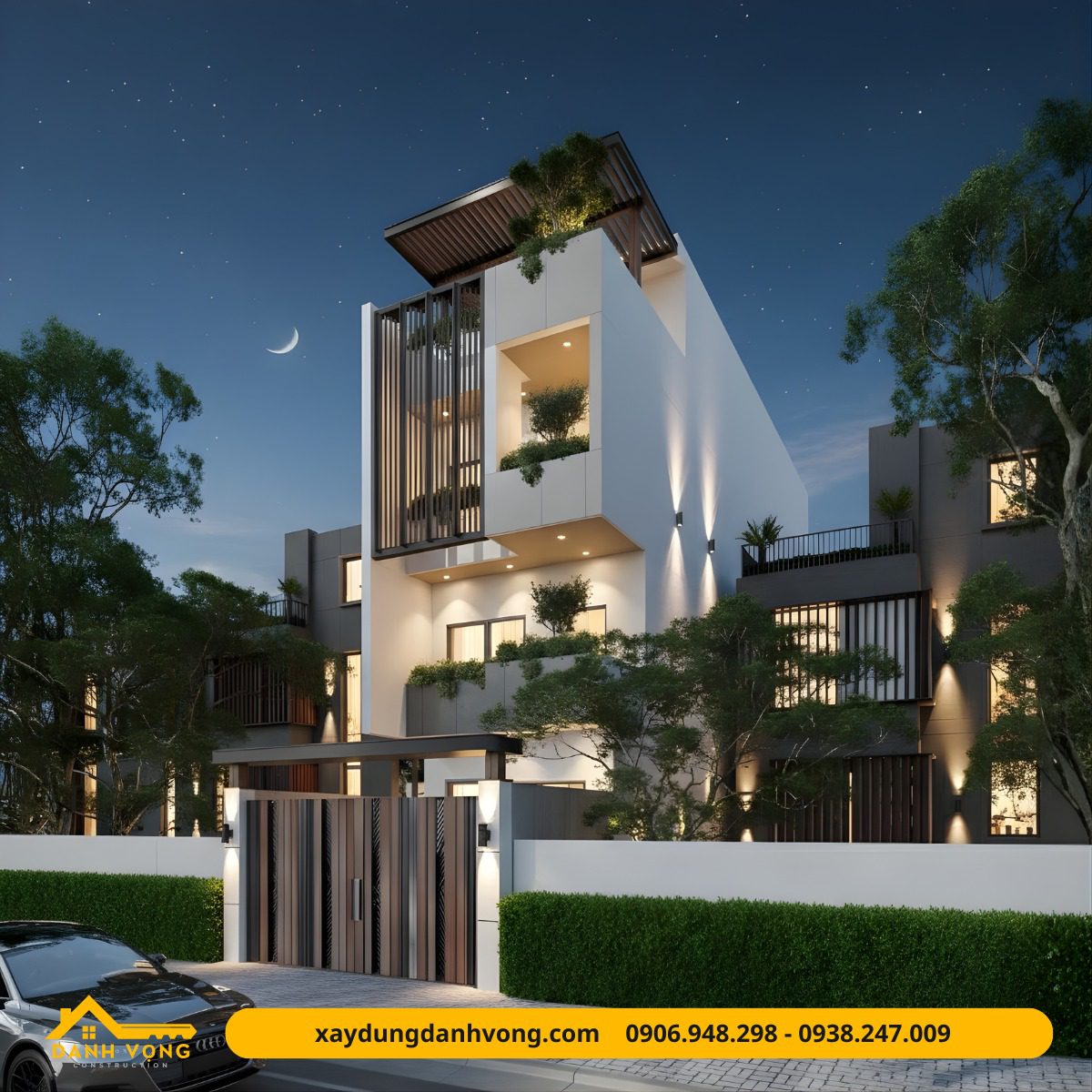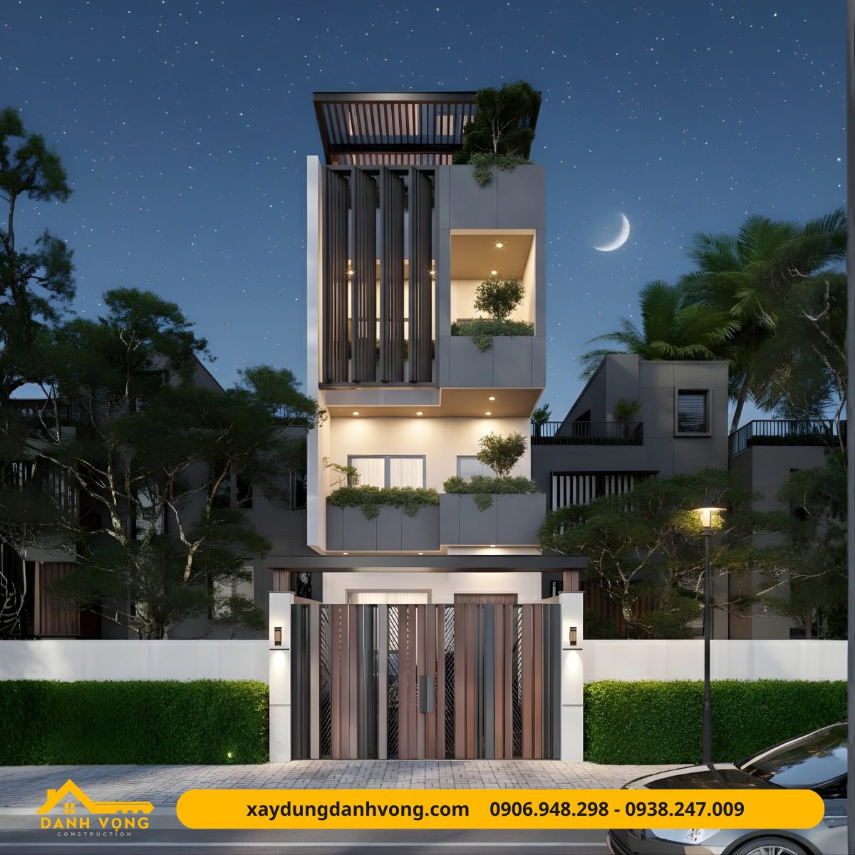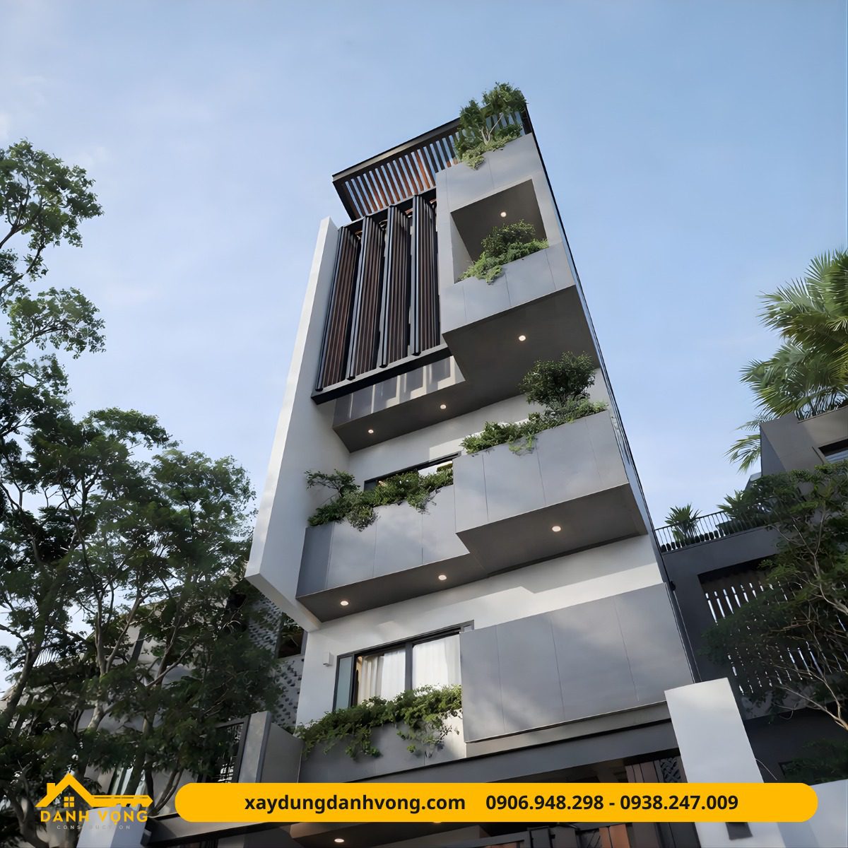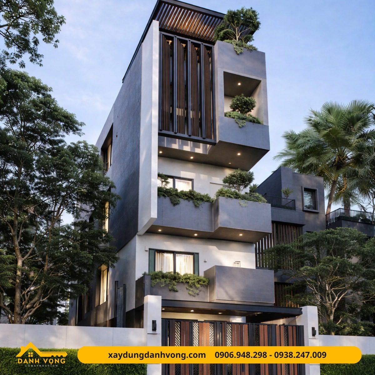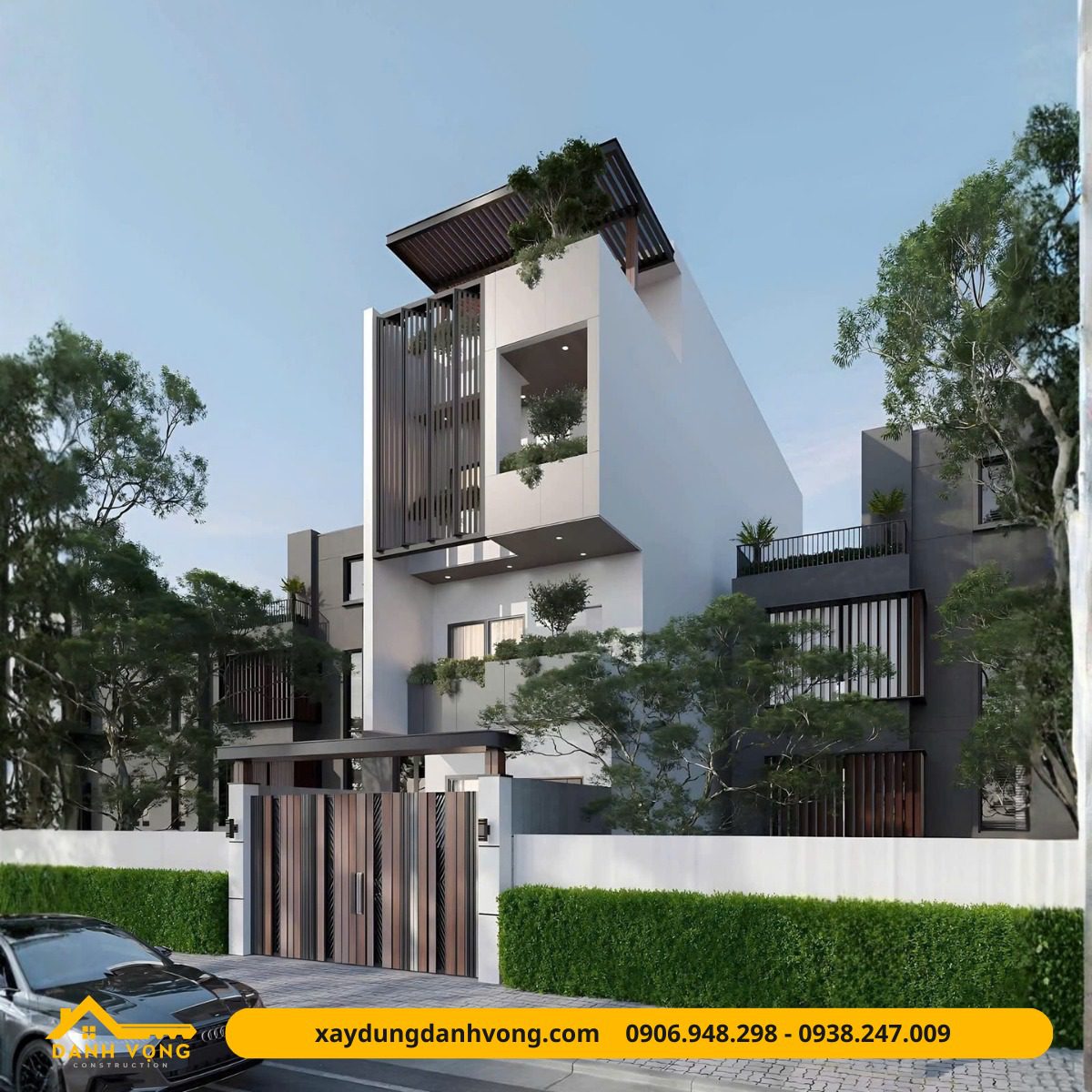 Sự kết hợp giữa kiến trúc hiện đại và mảng xanh là giải pháp sống bền vững mà Danh Vọng luôn ưu tiên trong các thiết kế nhà phố nhiều tầng.