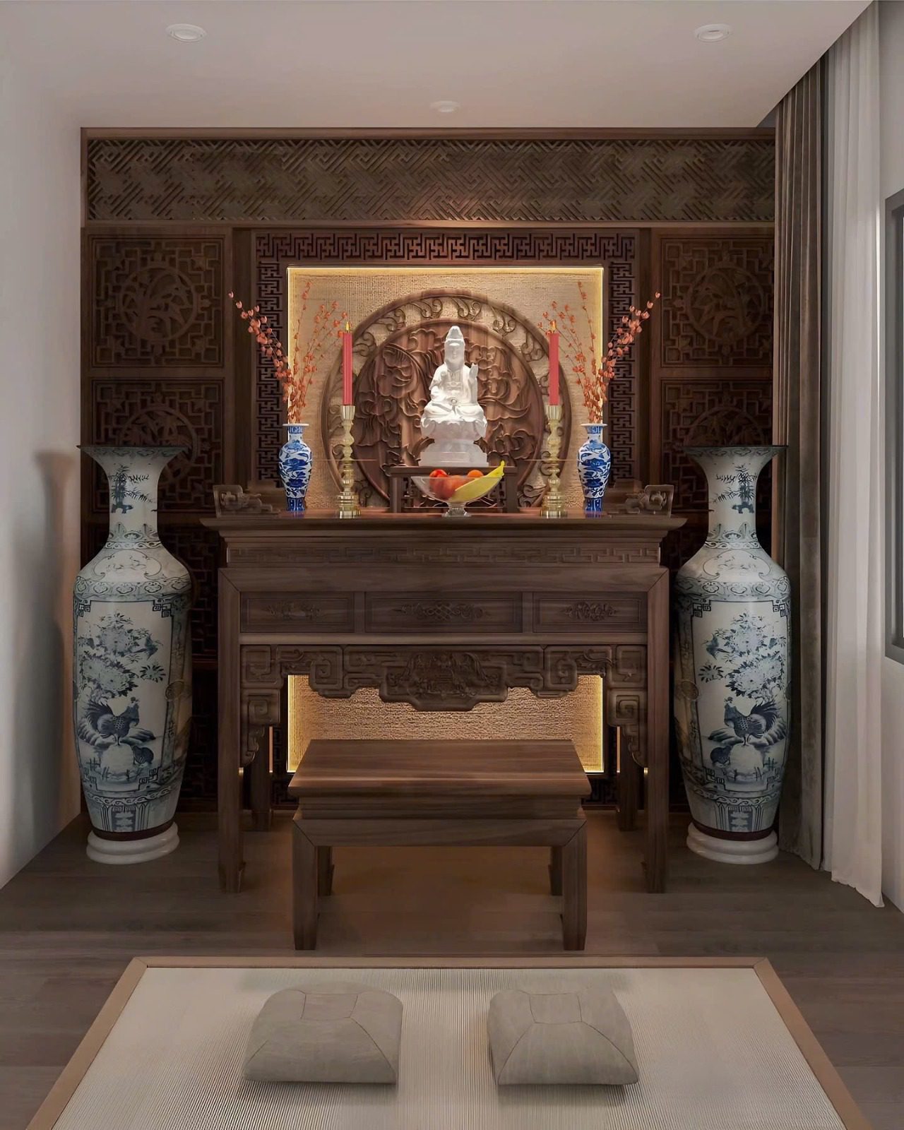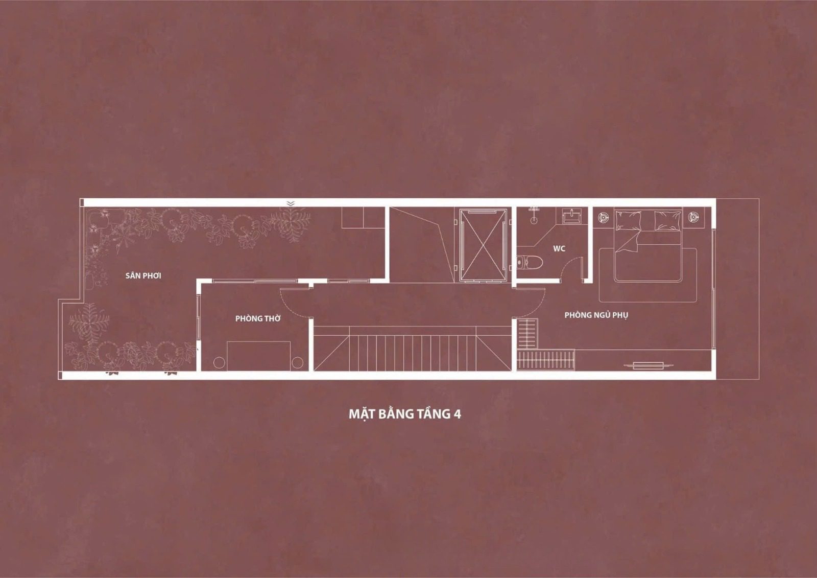 Không gian dành cho phòng thờ, phòng sinh hoạt chung hoặc làm việc tại nhà. Sân thượng phía trước và sau có thể bố trí cây xanh, khu thư giãn hoặc giặt phơi, giúp tầng cao nhất luôn thoáng và nhẹ nhàng.