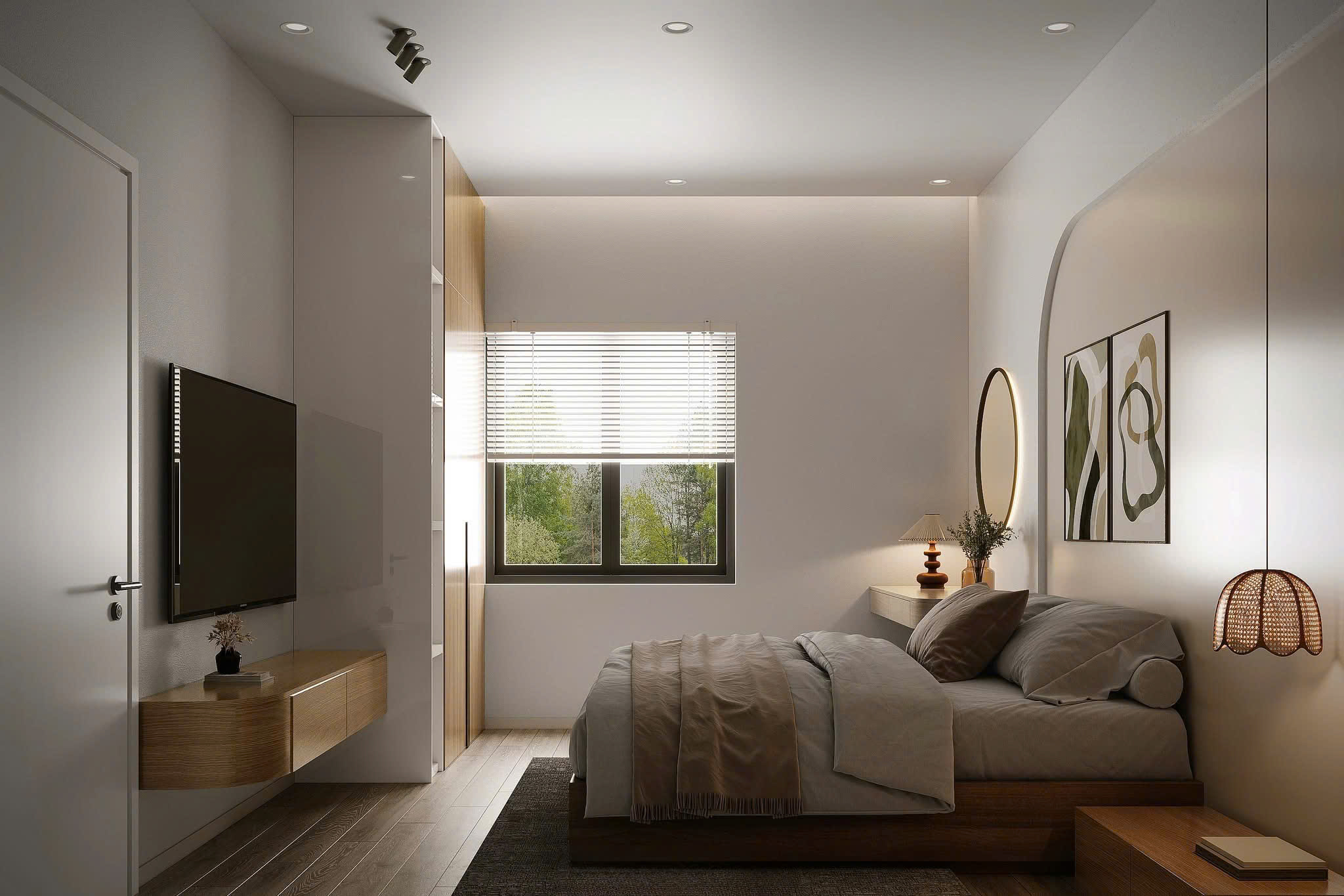 Phòng ngủ được thiết kế theo tinh thần ít chi tiết – nhiều cảm xúc. Giường thấp, đầu giường bo cong mềm mại tạo cảm giác an toàn, thư giãn.