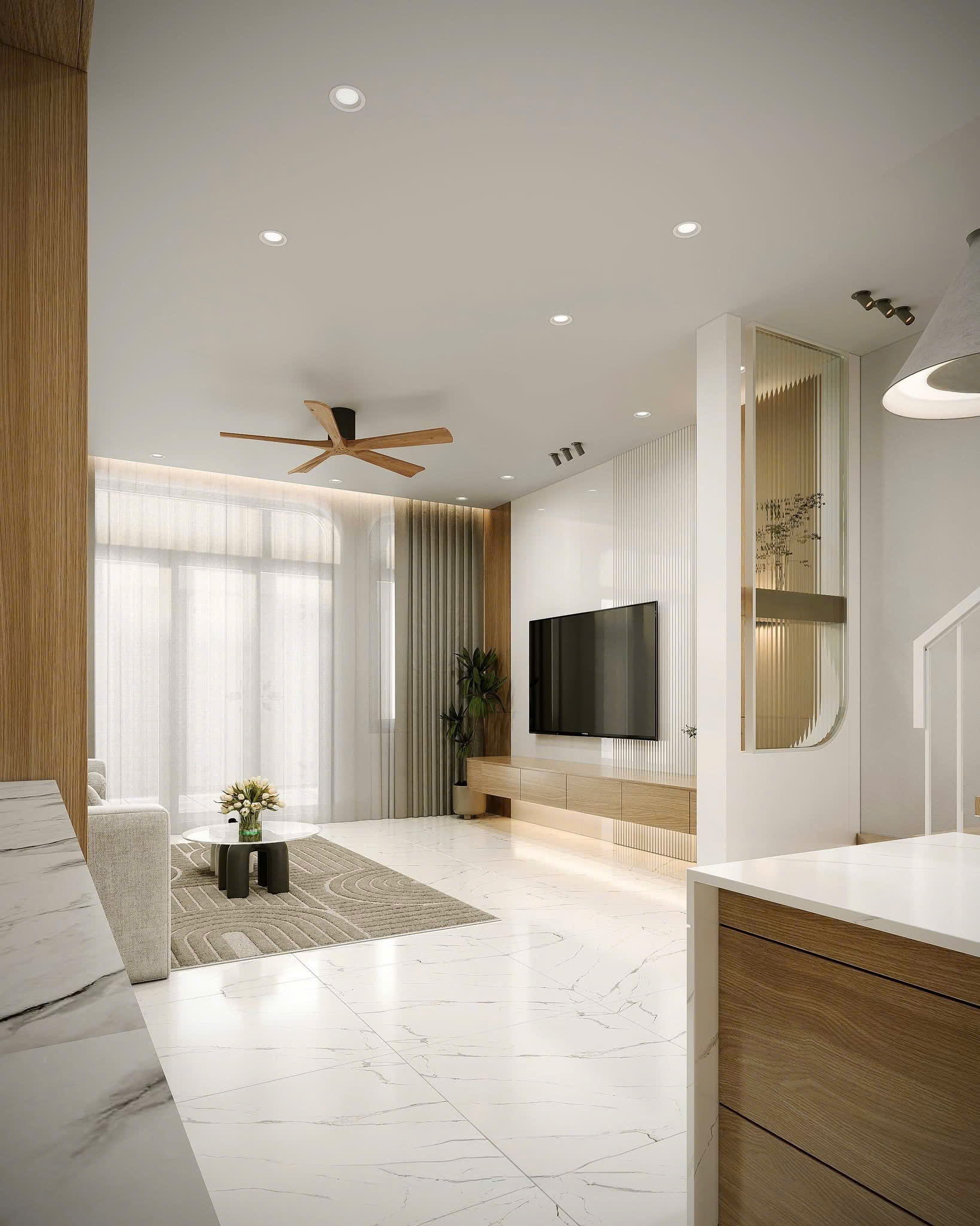 Không gian phòng khách gây ấn tượng với bảng màu trung tính ấm: trắng – be – gỗ tự nhiên, tạo cảm giác rộng rãi nhưng không lạnh lẽo.