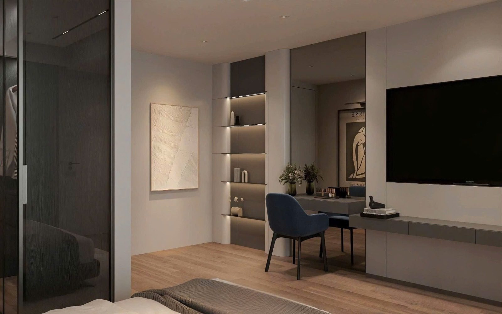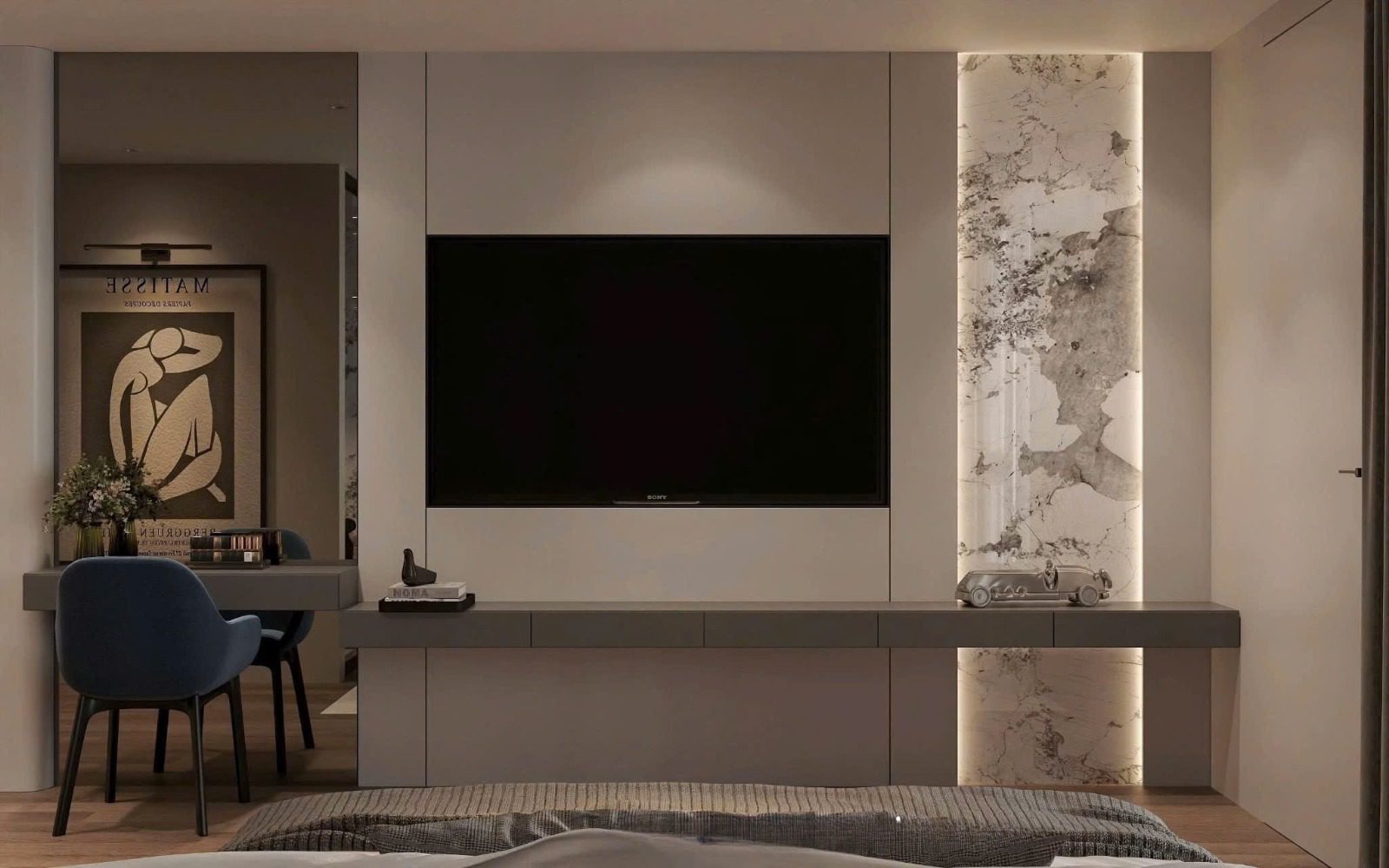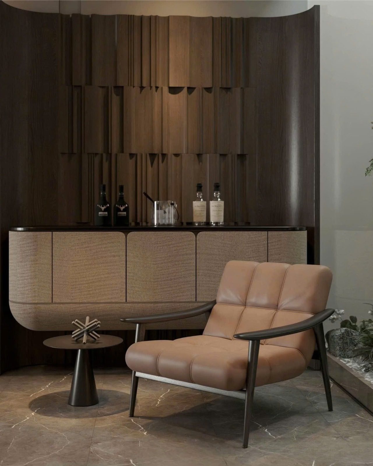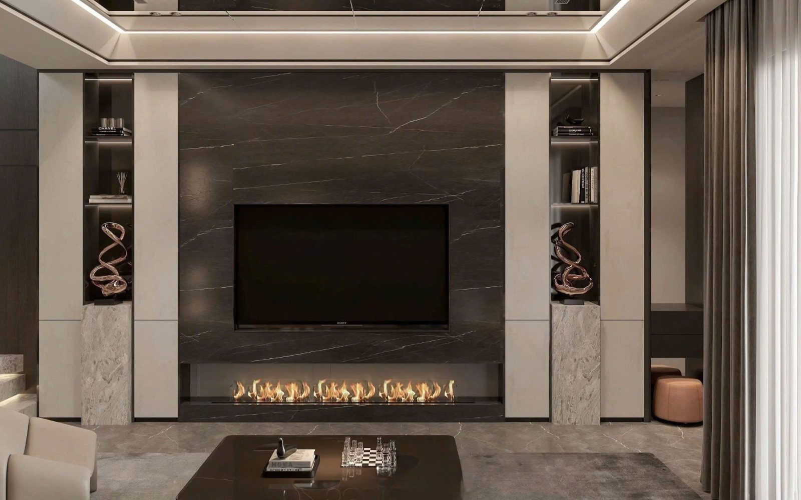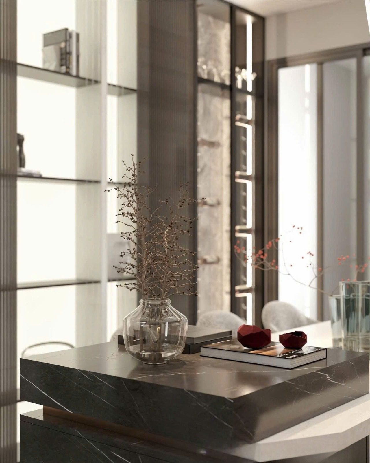 Vật liệu chủ đạo: gỗ veneer, đá trung tính, kính và kim loại sơn đen mờ