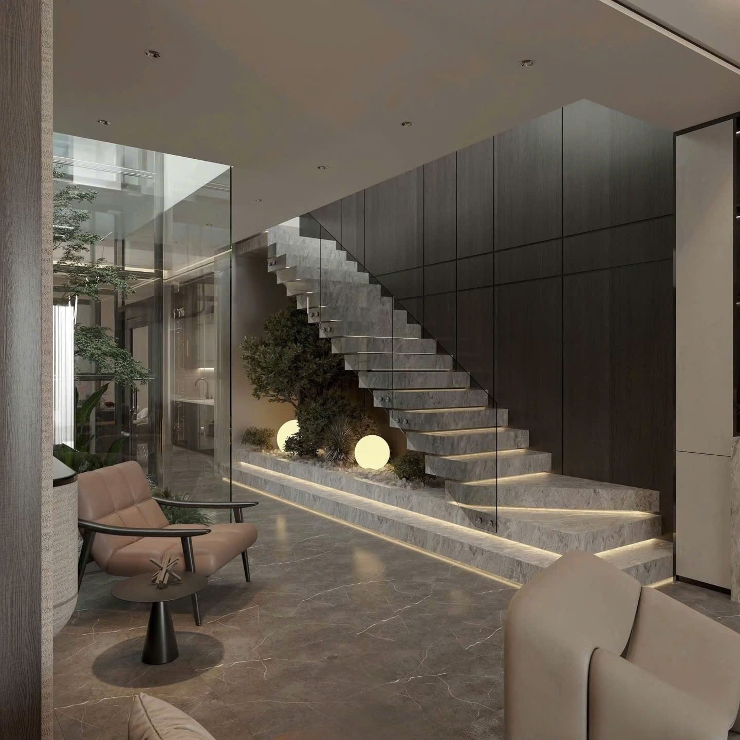 Cây xanh bố trí thấp – cao đan xen, kết hợp đèn âm sàn tạo chiều sâu