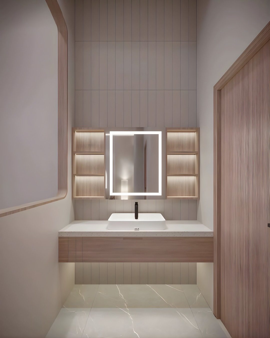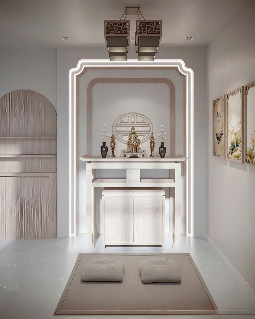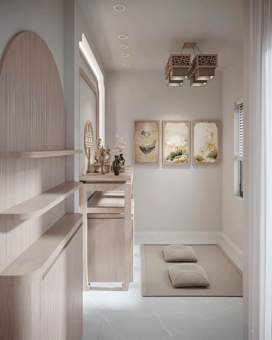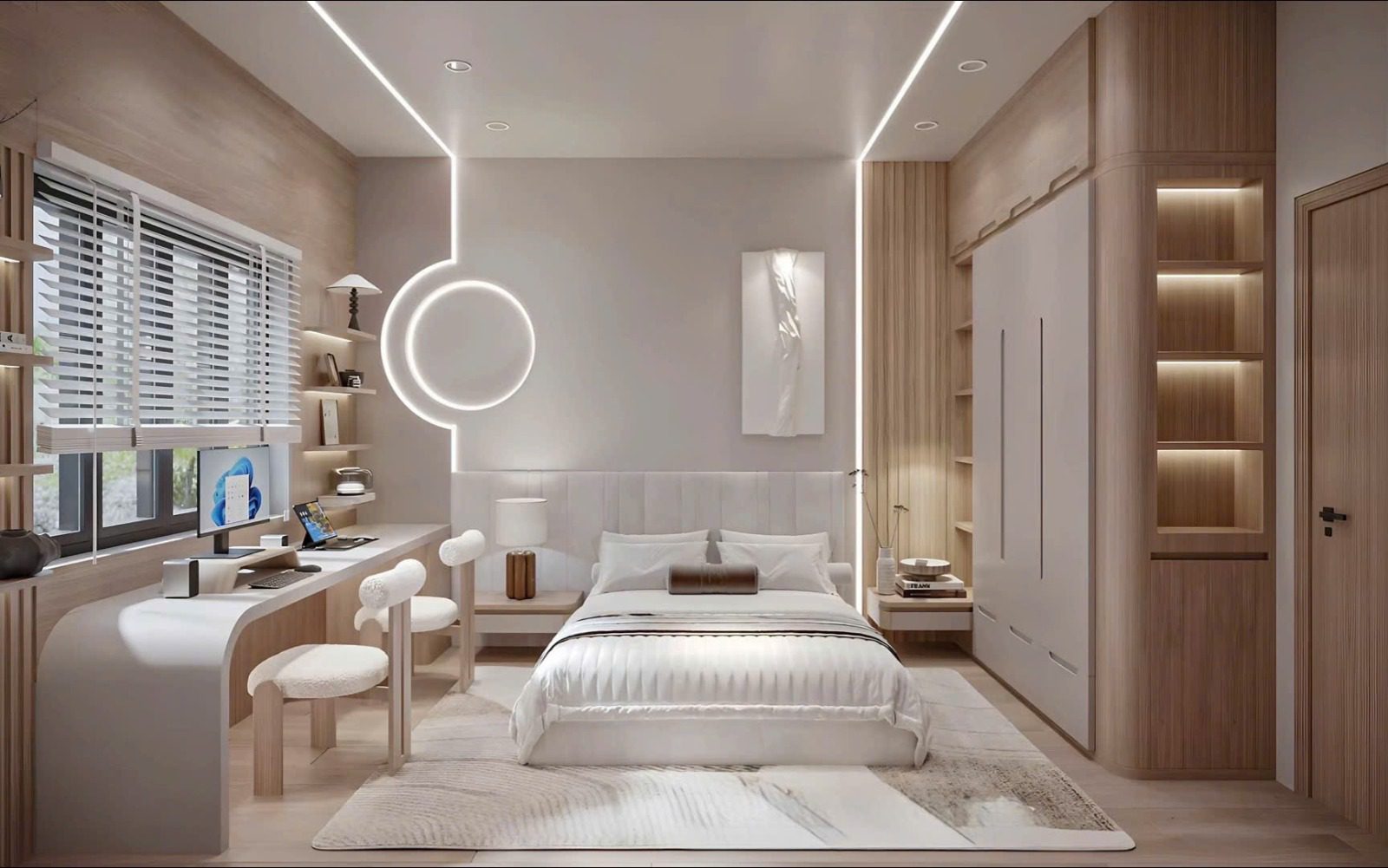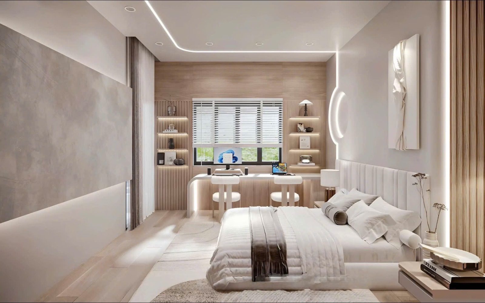 Gam trắng kem được sử dụng làm nền, kết hợp gỗ sồi sáng và các chi tiết bo cong mềm mại, giúp không gian trở nên rộng rãi và thân thiện hơn.