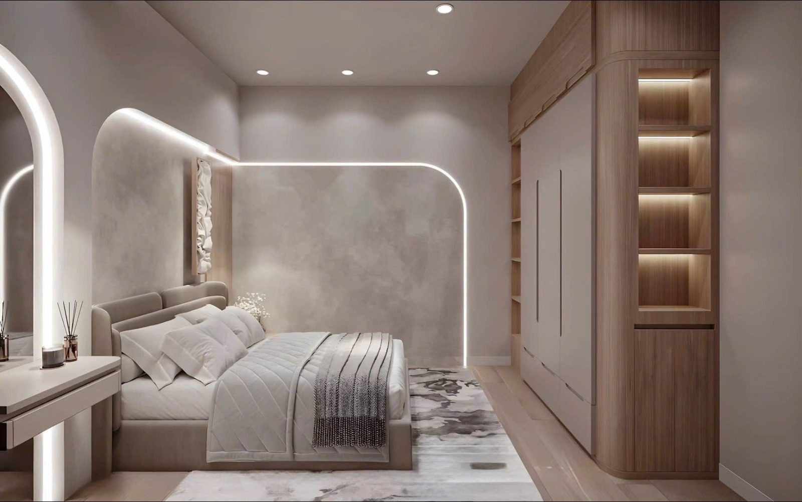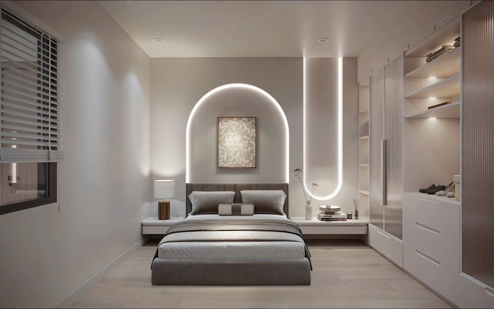 Hệ đèn LED tạo hình vòm phía đầu giường vừa là điểm nhấn vừa là ánh sáng thư giãn