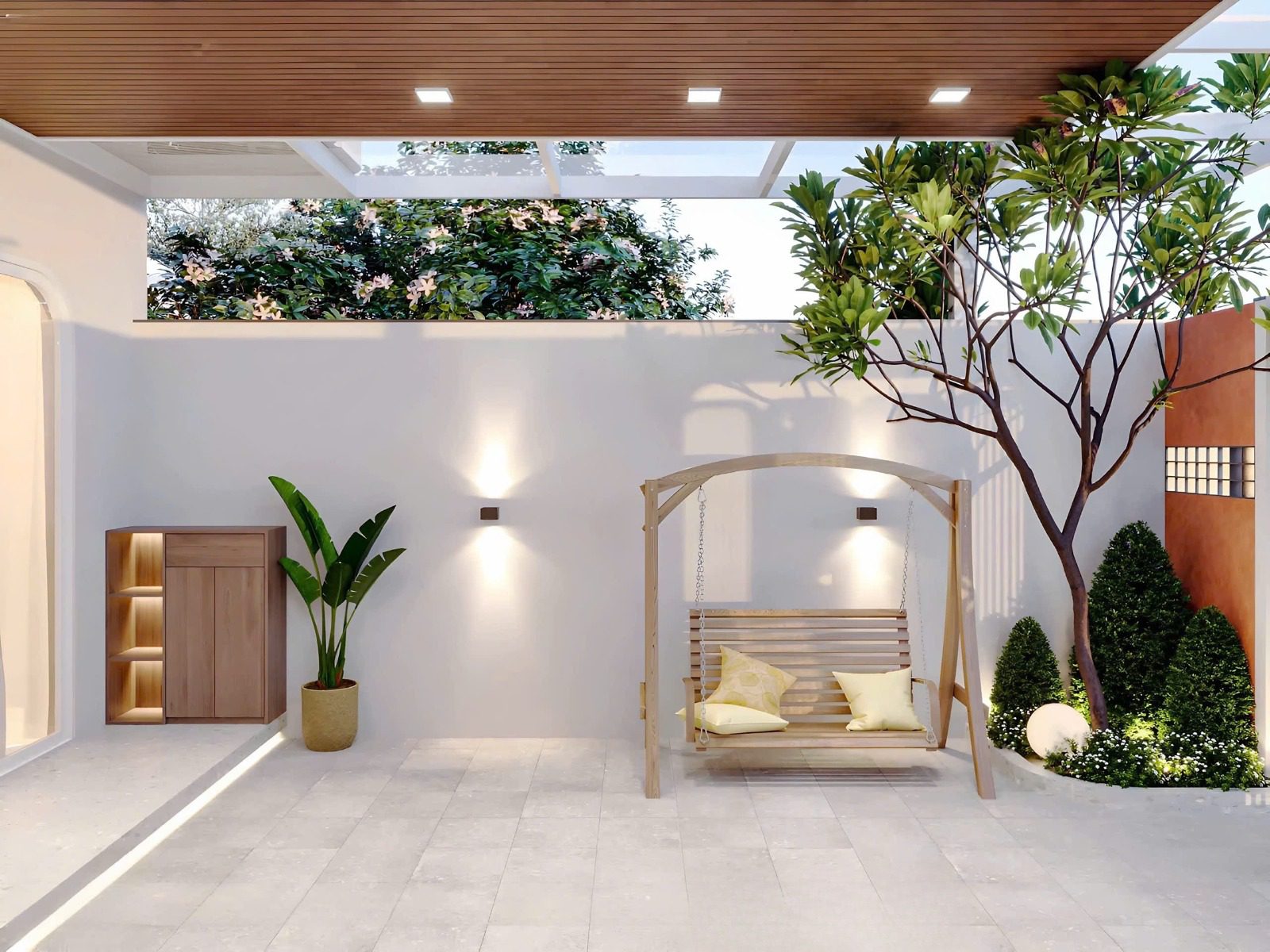 Ghế xích đu gỗ, cây xanh, ánh sáng tường hắt lên nhẹ nhàng tạo nên một không gian thư giãn lý tưởng – nơi có thể đọc sách, uống trà hoặc đơn giản là “ở yên” sau một ngày dài.