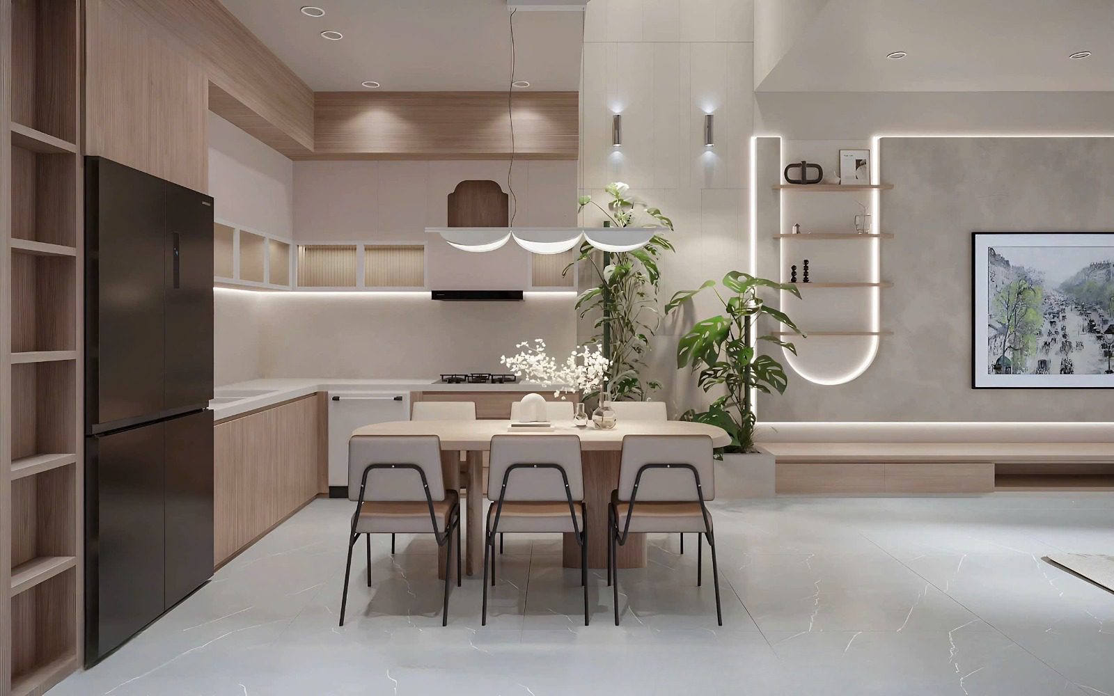 Khu bếp được bố trí cuối nhà, liên thông với phòng ăn theo dạng không gian mở nhưng vẫn có sự phân tách tinh tế bằng ánh sáng và vật liệu.
