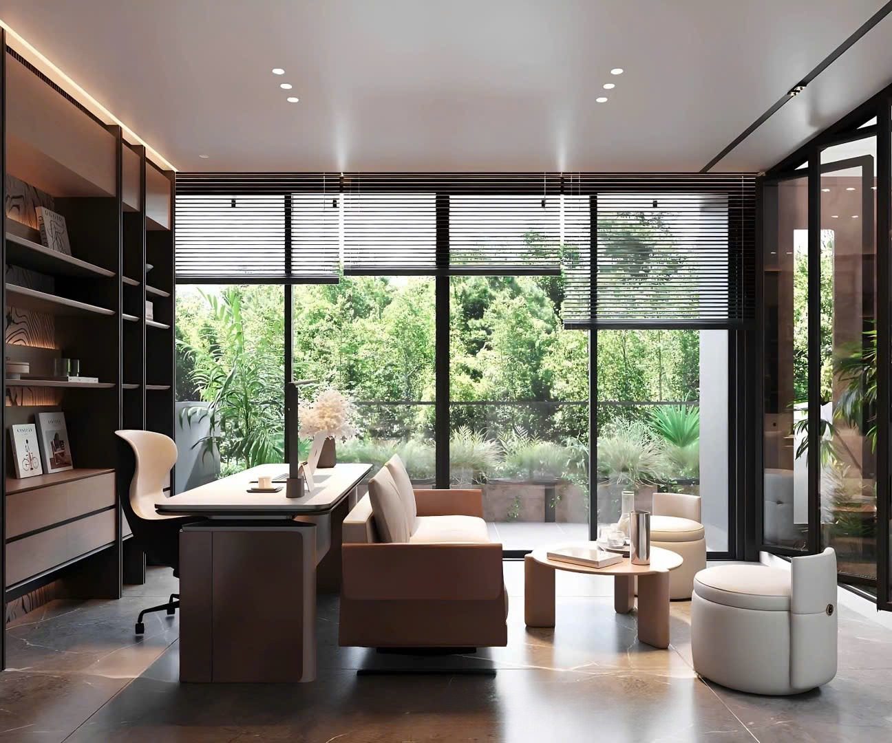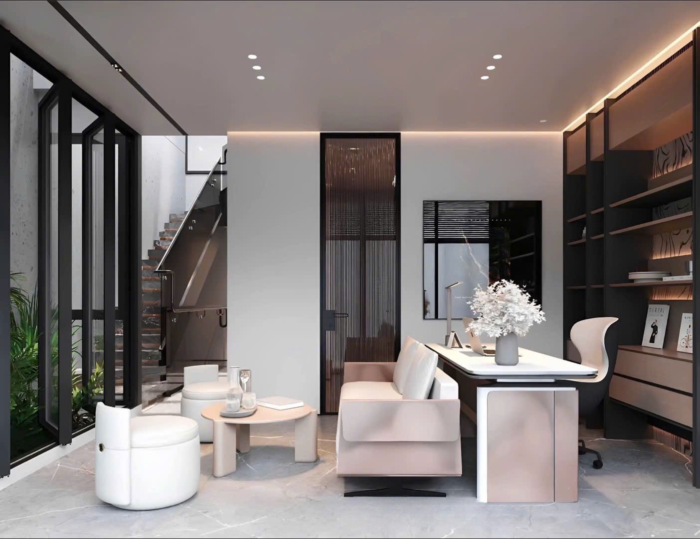 Góc làm việc được bố trí gọn gàng, tách nhẹ khỏi khu sinh hoạt chung nhưng vẫn kết nối bằng ánh sáng.
