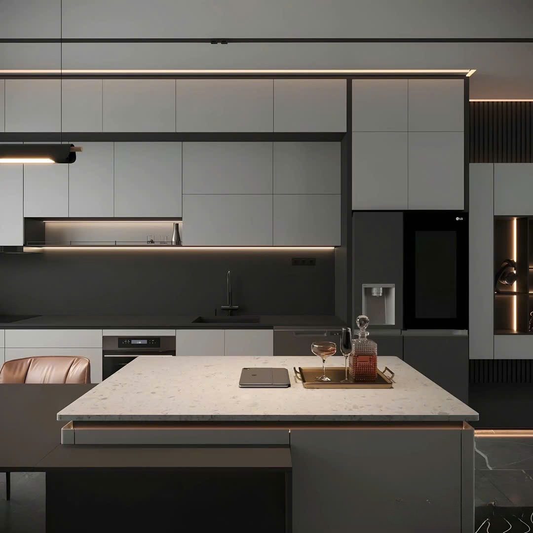 • Hệ đèn LED hắt dưới tủ & chân đảo được tính toán chuẩn: