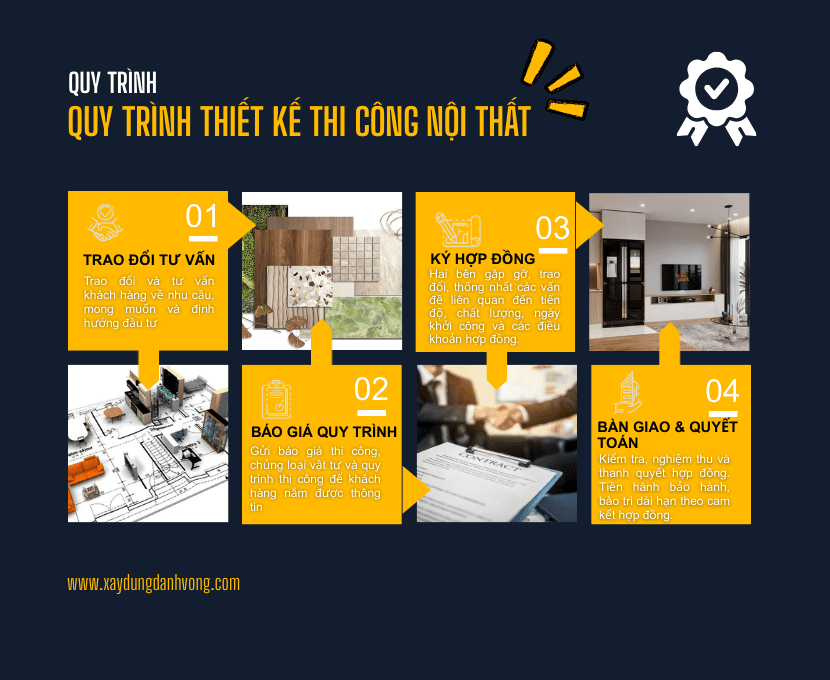 Thiết kế thi công nội thất xd Danh Vọng gồm 04 bước cơ bản, cụ thể như sau: